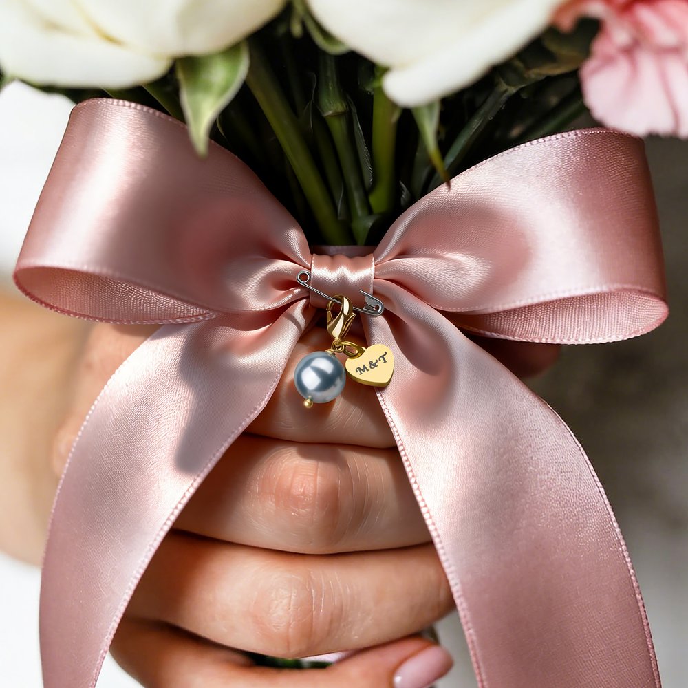 Designed as a bouquet accessory, it securely fastens the bride's flowers, enhancing the blue-themed wedding ambiance. It can also be kept separately as a wedding keepsake, adding a touch of elegance to any display or memory box.