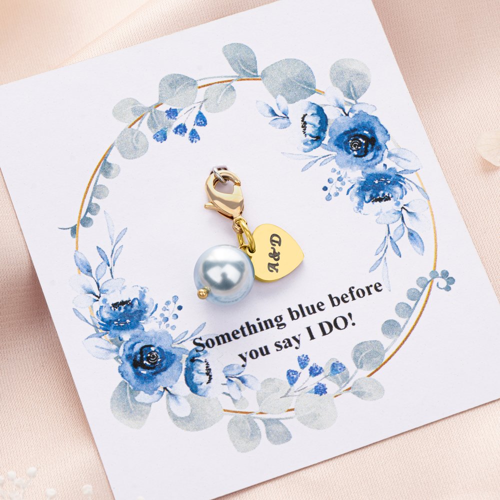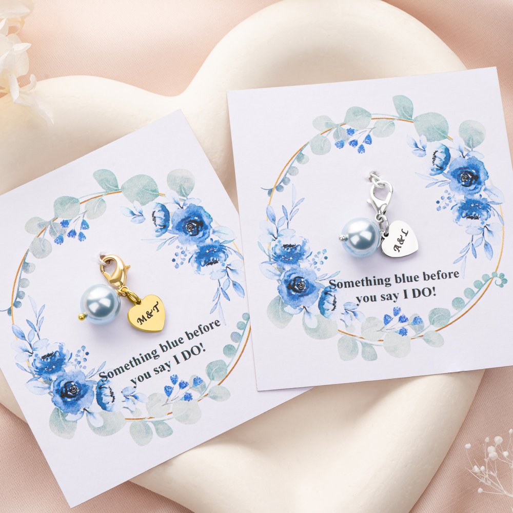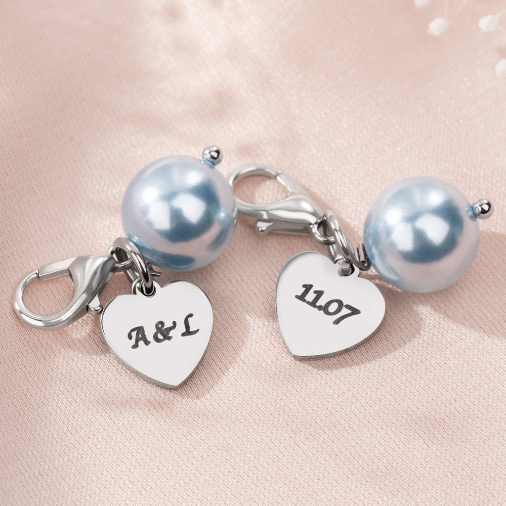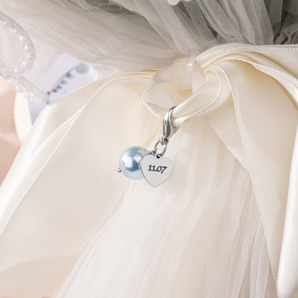 This blue pearl heart-shaped bouquet clip, adorned with light blue pearls and heart decorations, is perfect for a blue-themed wedding. It's available in silver and gold pendant colors and can be customized with your name, making it a truly unique wedding keepsake.