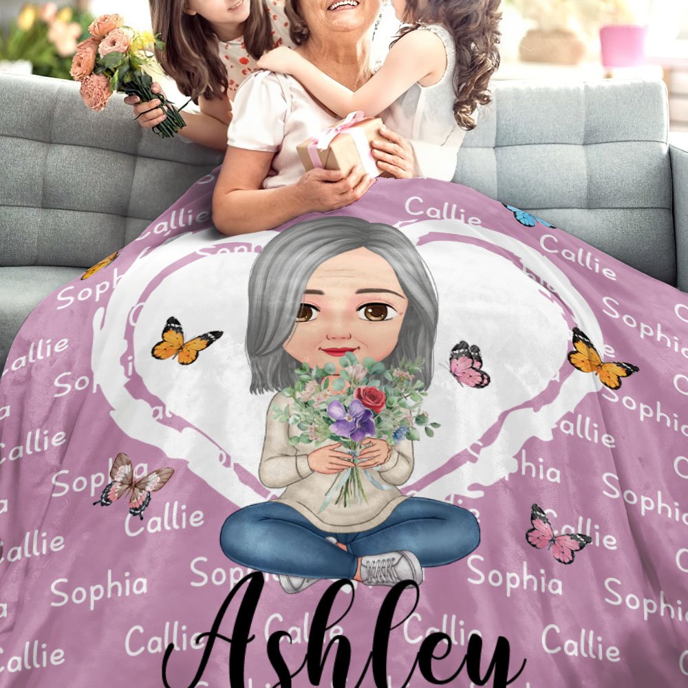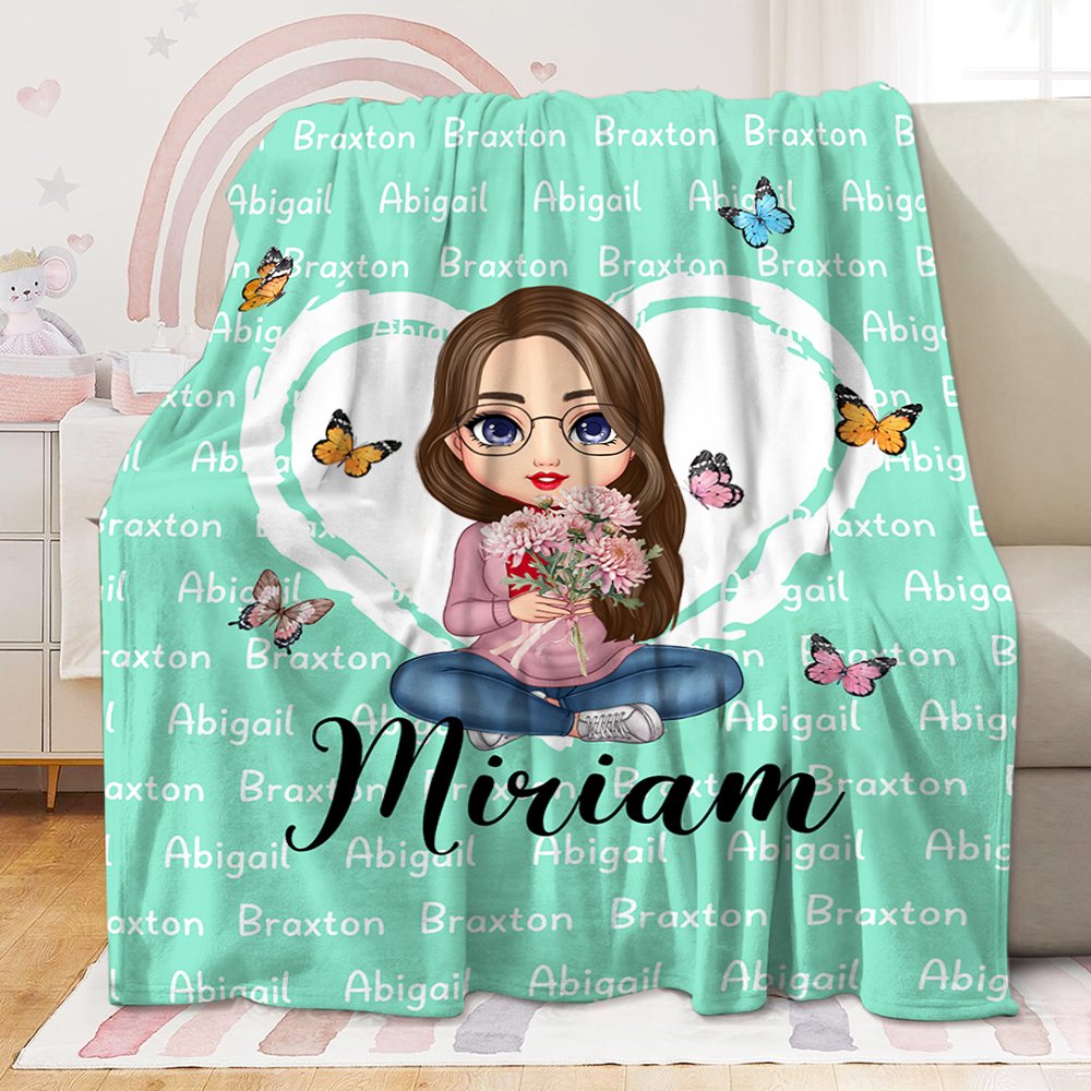 This charming blanket captures the essence of joy and love with its bright multi-colored butterflies and playful heart design. The cute female cartoon characters add a touch of whimsy, making it a delightful addition to any cozy space. You can customize it with your name and birthday flowers, turning it into a unique keepsake that reflects your personality.