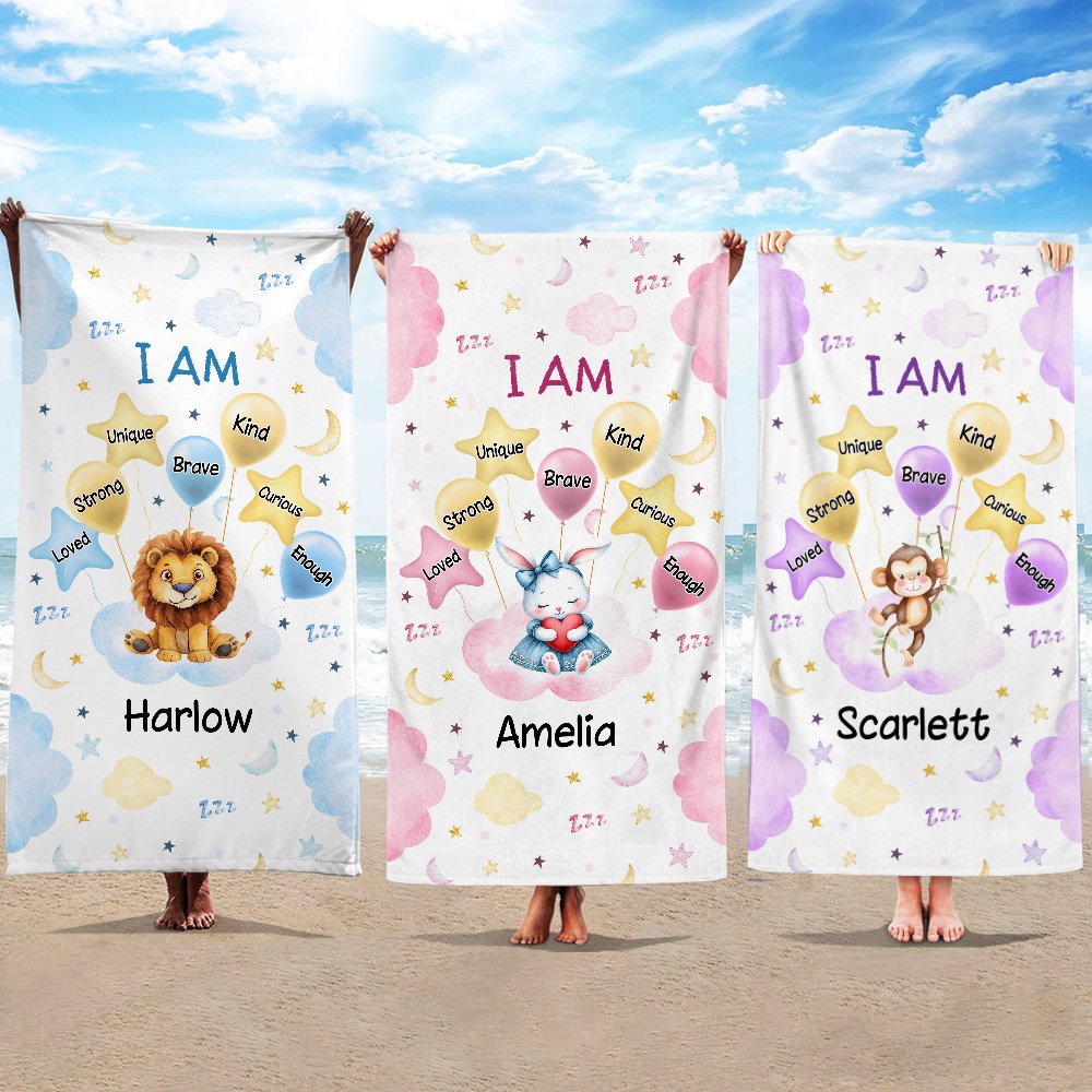 This beach towel features cute watercolor-inspired animal prints paired with balloons, stars, and the moon to create a dreamy and homey atmosphere. The text on the beach towel conveys positive self-affirming messages such as unique, kind, brave, strong, curious, loved, and good enough, which is a blessing and affirmation for the child and helps to boost their confidence and self-esteem. There are 37 different animal patterns to enrich your choice. Customize it with your child's name to make it even more special.