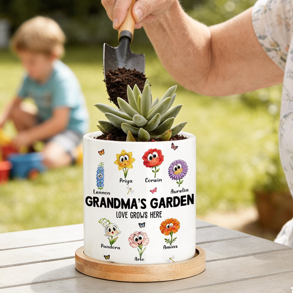 This planter pot features a cozy garden theme and can hold up to 16 birth flowers, each adorned with cute cartoon anthropomorphic expressions and decorated with lively butterflies and dragonflies, creating a vibrant and soothing atmosphere. Below each birth flower, you can add the name of a family member, making each pot a unique family garden.