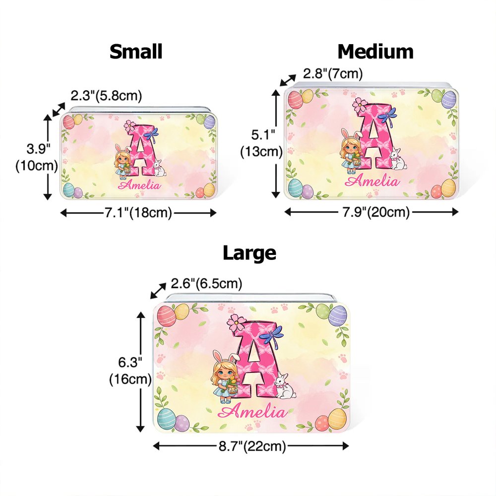 Crafted with a delightful ensemble of playful Easter characters and vibrantly decorated eggs, this decorative tin evokes the whimsy and renewal of the season. Each design is brought to life against a softly blended pink-and-yellow gradient or a crisp blue-and-white backdrop, lending a dreamlike, airy charm. Personalization with a name and initial transforms it into a bespoke piece of holiday art.