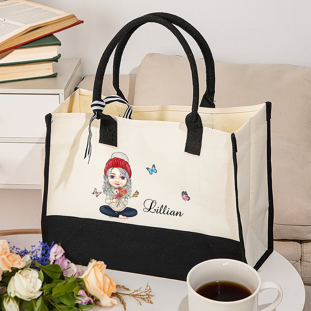 What sets this tote apart is the personalization option. This unique bag features a charming cartoon character design and a beautiful birth flower corresponding to the recipient's birthday month. This thoughtful detail transforms a simple tote into a cherished keepsake.