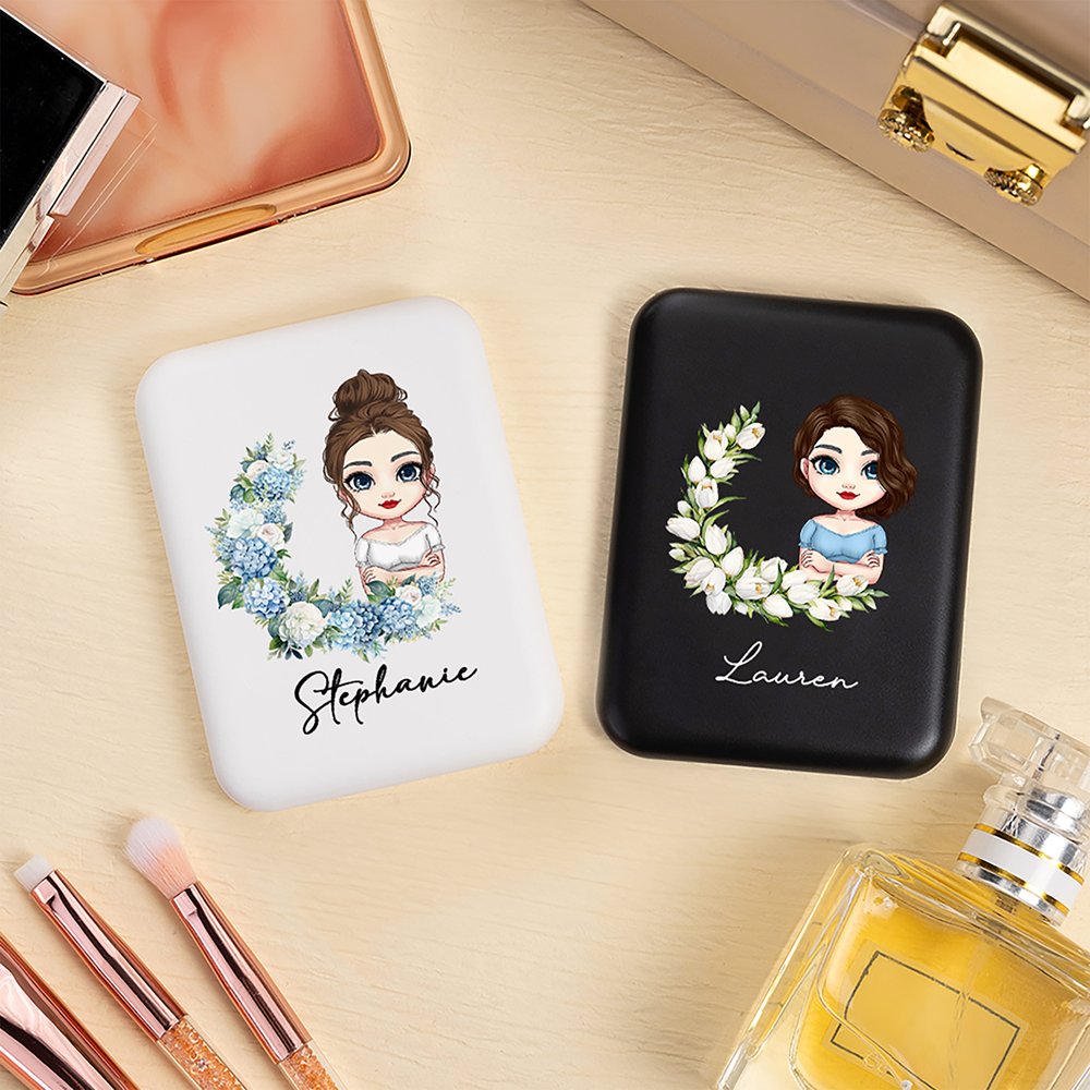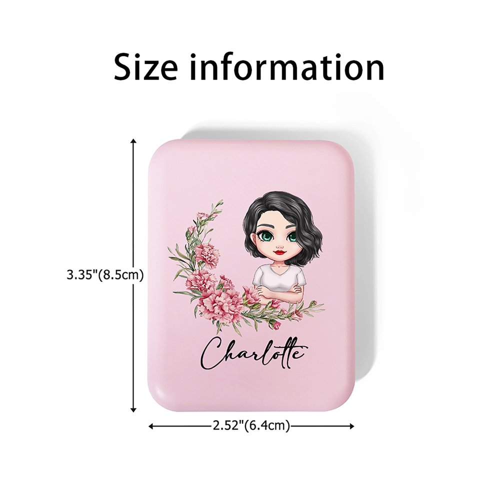 Personalised Cartoon Character Birth Flower Portable LED Double-Sided Makeup Mirror with Name Birthday Bridesmaid Gift for Women