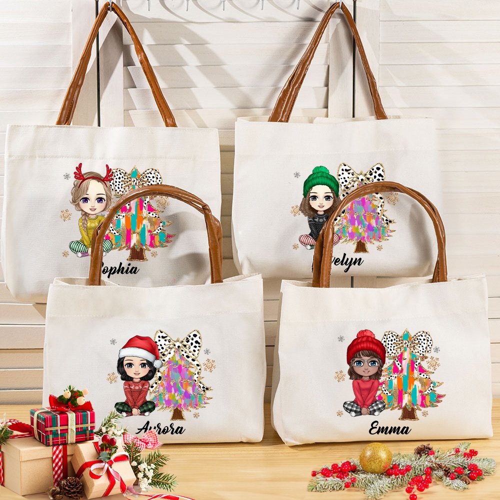 Our tote bag features a glittering, colorful Christmas tree design with a delicate bow on top and a highly personalizable cartoon girl image, which is playful and cute, perfect for the Christmas atmosphere. You can add your name to it to create a unique souvenir.