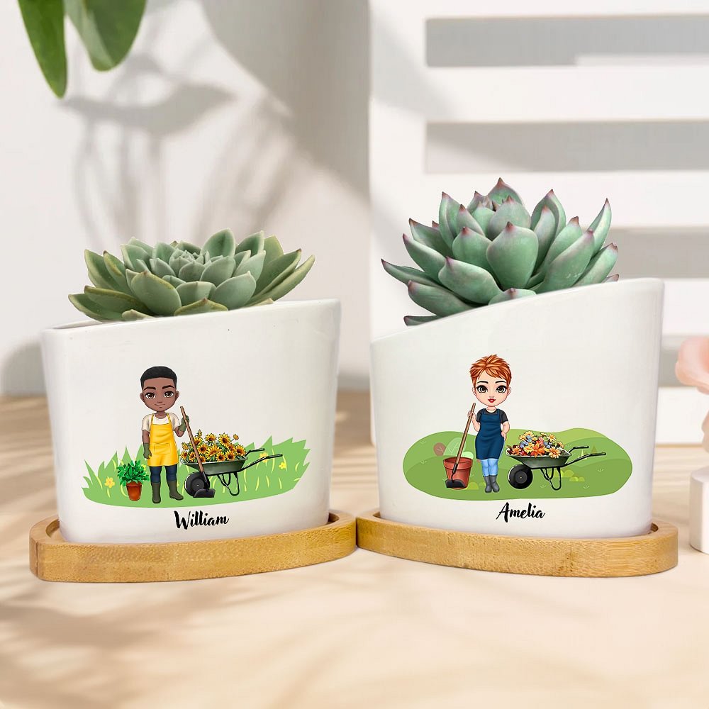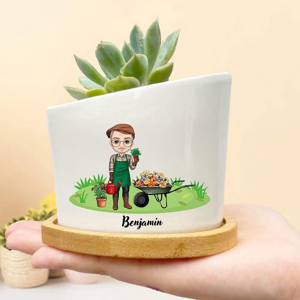 This plant pot is designed for gardening enthusiasts, featuring cute cartoon characters on the front. You can customize the appearance of the cartoon character based on a specific person and add gardening-related elements to bring a lively atmosphere to the pot. Additionally, you can customize the text below the character to give it a unique and Personalised touch.