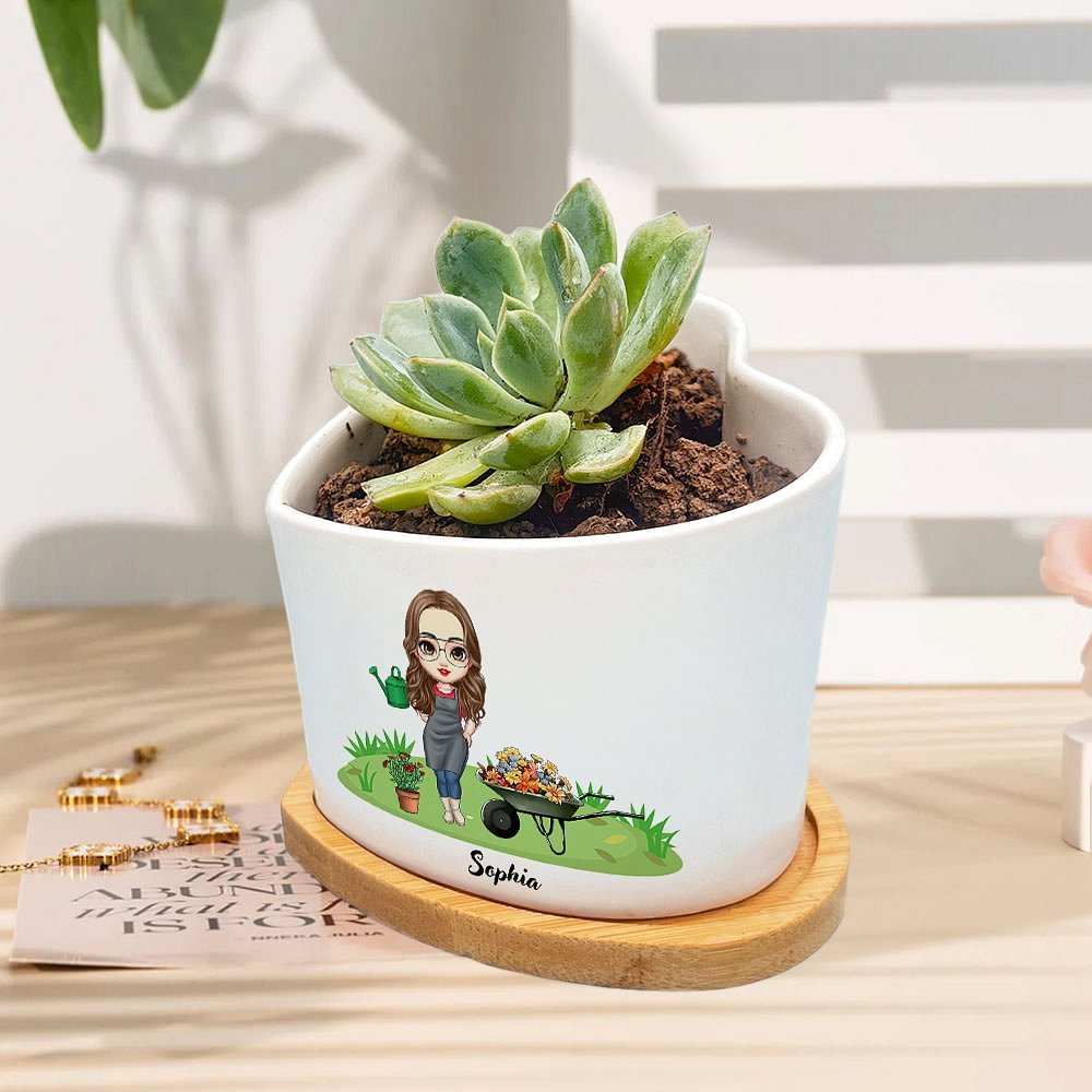 Personalised Cartoon Character Heart-shaped Ceramic Plant Pot with Name and Bamboo Base Home Decor Birthday Gift for Gardening Lovers