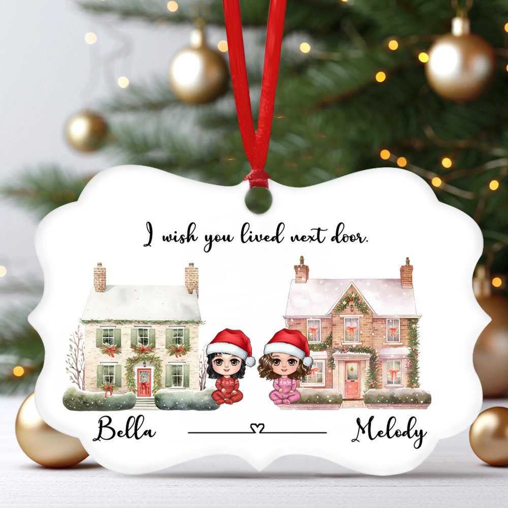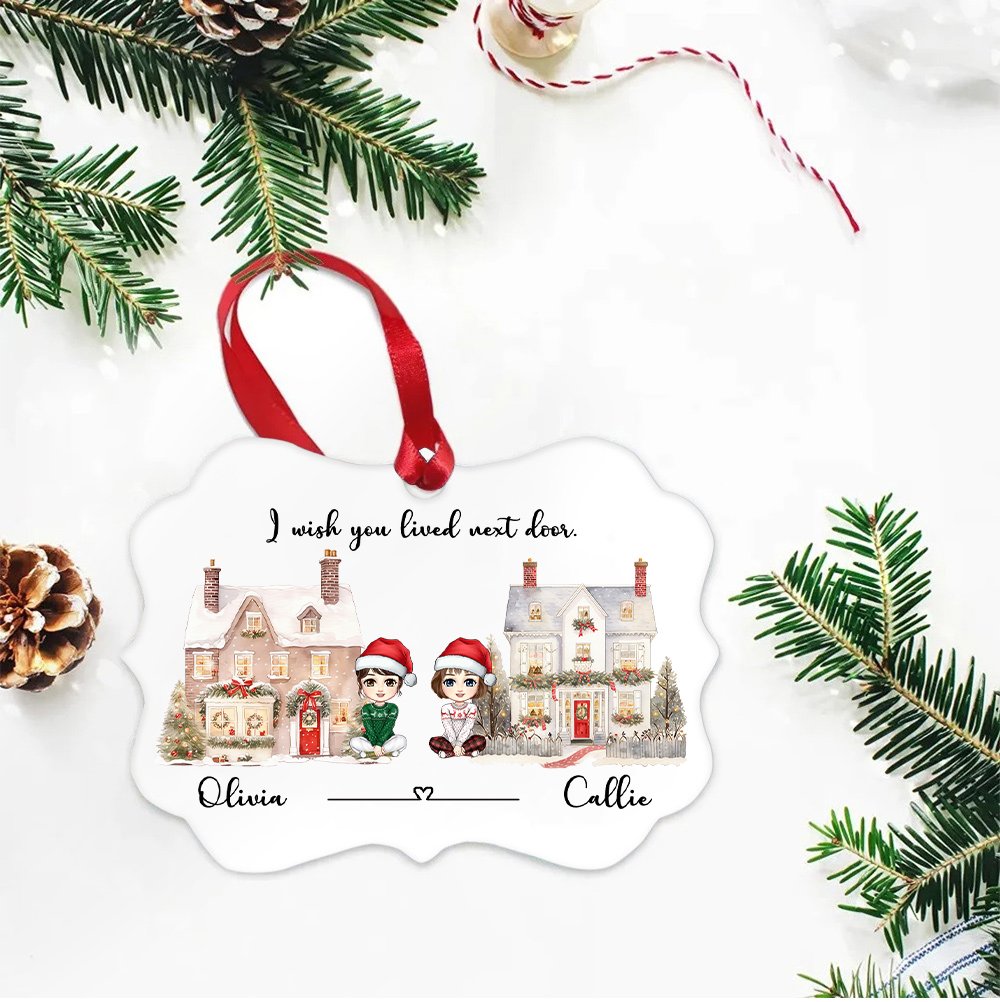 This ornament is different from the traditional round or square, it uses a unique shape design. The ornament is printed with two cartoon characters and exquisite house and Christmas tree elements, which adds infinite creativity and fun to the holiday decoration. The ornament is also printed with the fixed text "I wish you lived next door", and the pendant can also be customized with a name to make it more special.