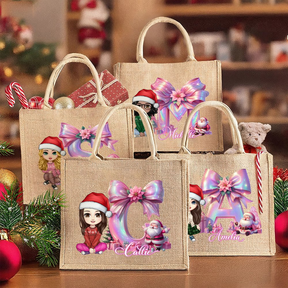 This jute tote bag is designed with a "holiday exclusive feeling" as its core, featuring cute Christmas cartoon characters - a Christmas character wearing a red hat, a gift box tied with a bow, and bright and lively patterns, instantly filling the Christmas atmosphere. What's even more thoughtful is the exclusive customization service: the recipient's name and initials can be printed on the bag, and the letters are designed in round and cute fonts, complementing the cartoon pattern.