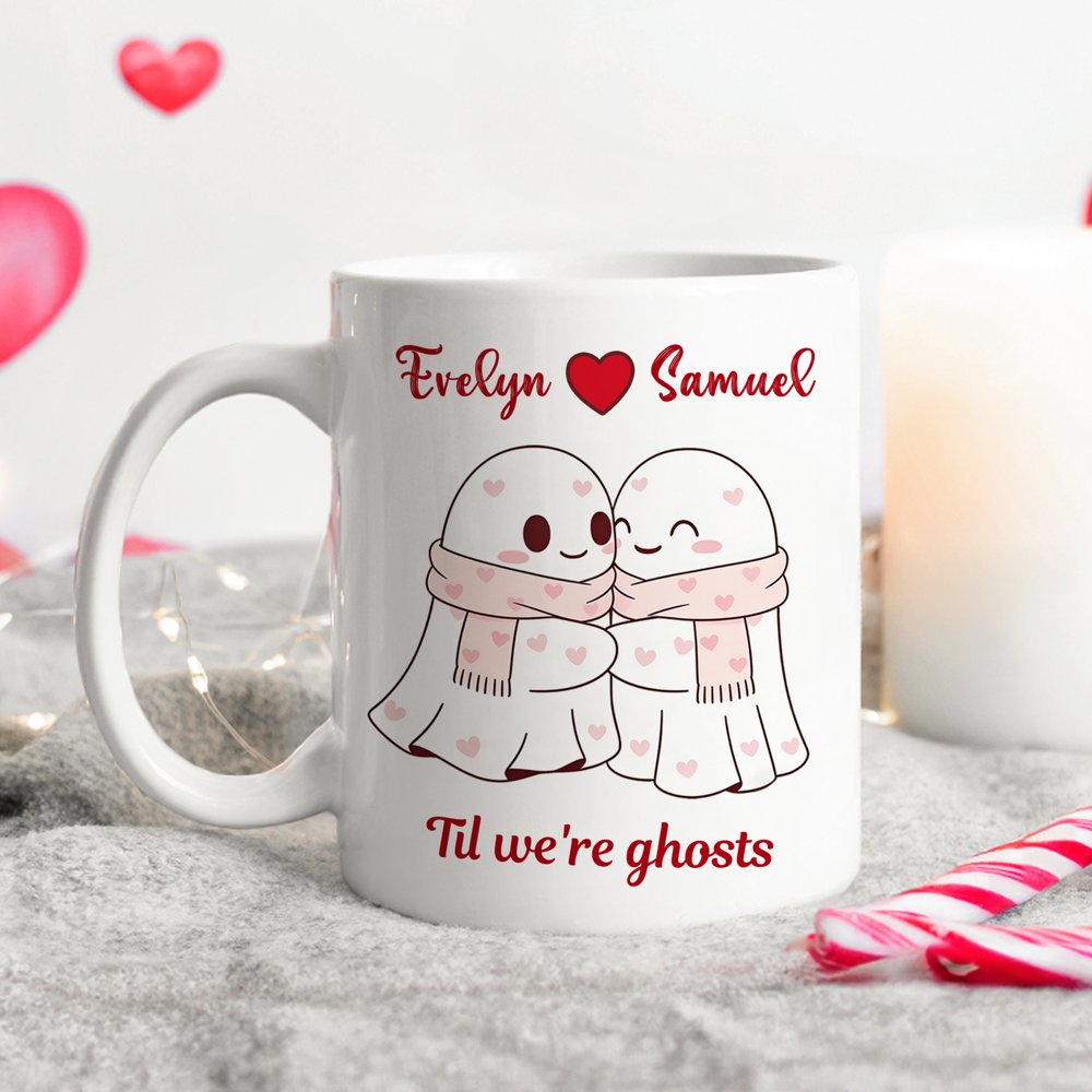Its white ceramic base features two chubby, pink-accented ghosts holding a large red heart together. Above the illustration, your custom names are printed in elegant script, and the phrase "Til we’re ghosts" sits below in matching playful lettering. The design blends cute, cozy charm with romantic depth, creating a look that’s both lighthearted and full of affection—perfect for celebrating long-lasting love.