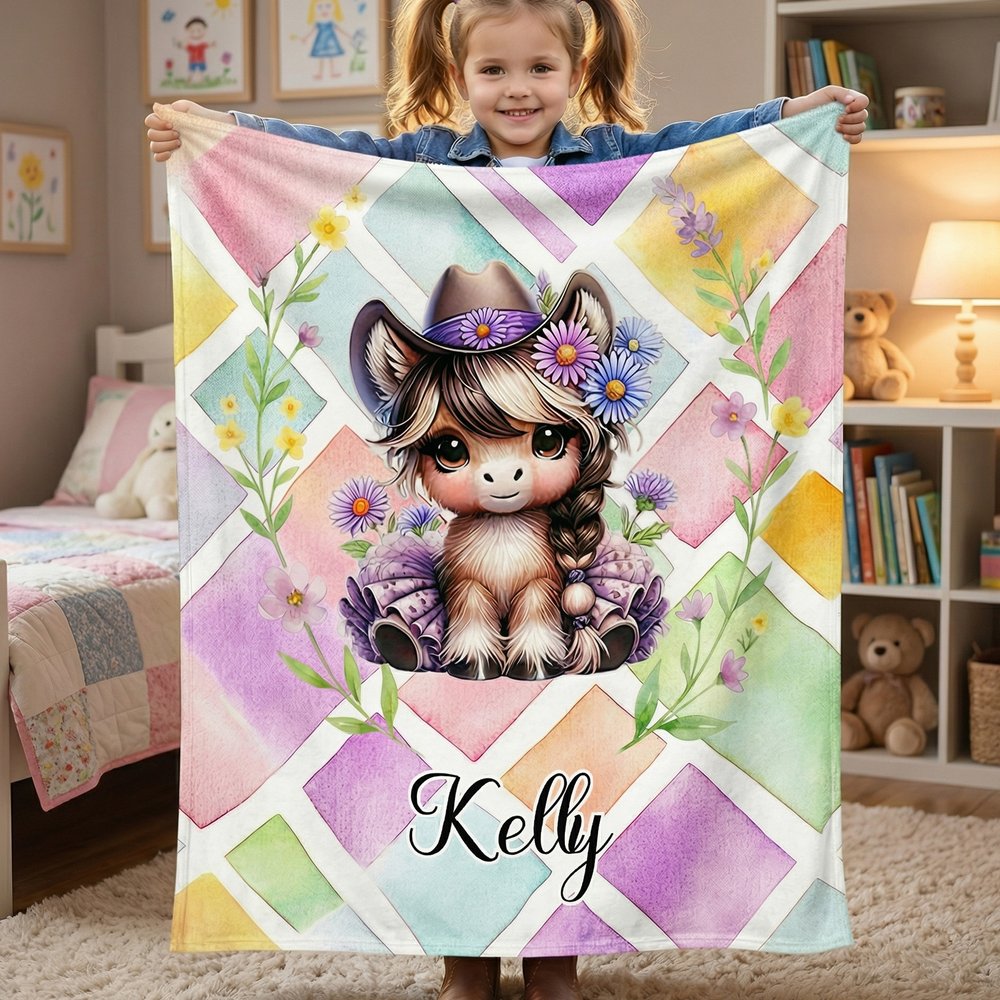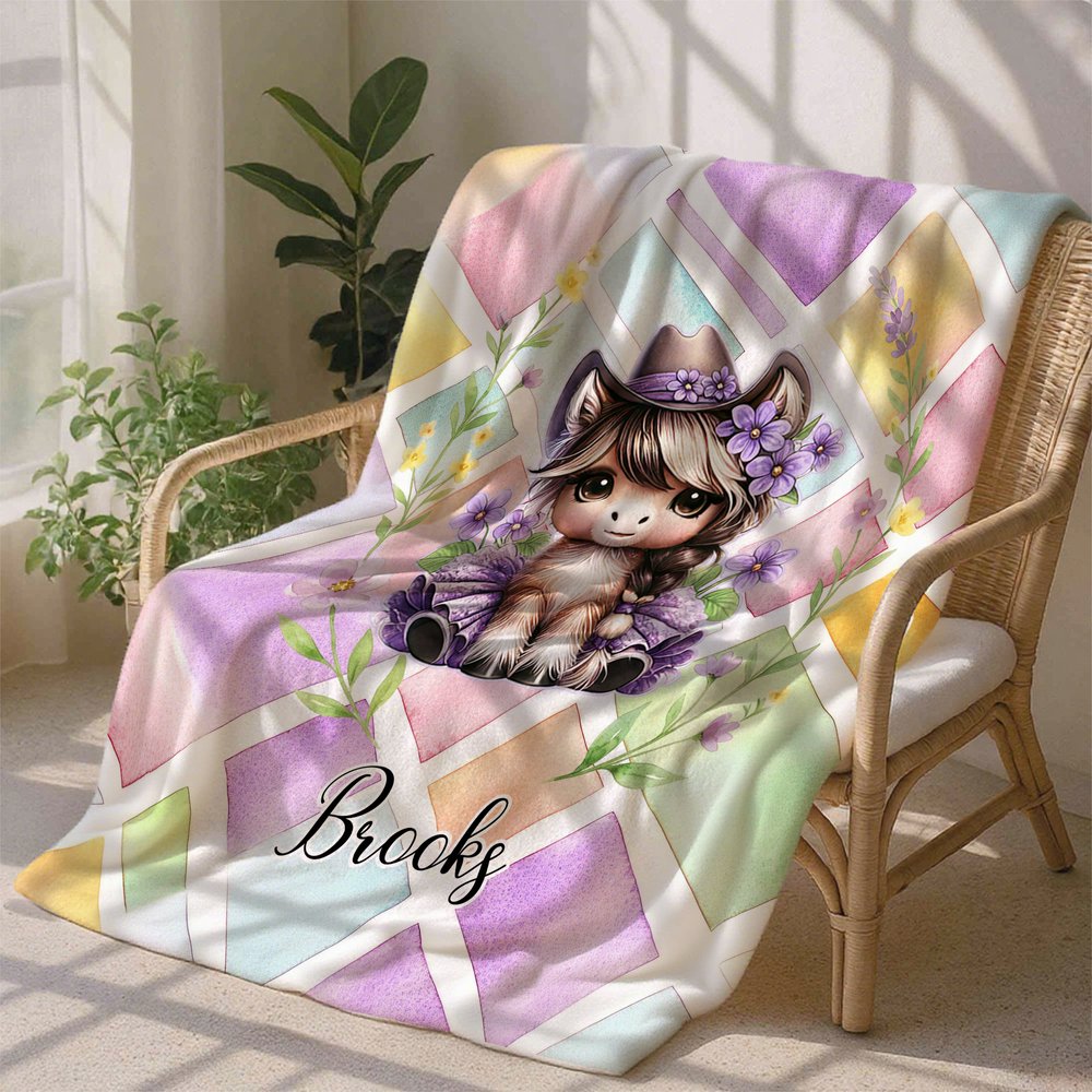 Personalised Cartoon Cowgirl Horse Birth Flower Soft Throw Blanket with Name Home Decor Birthday Gift for Girls Horse Lovers