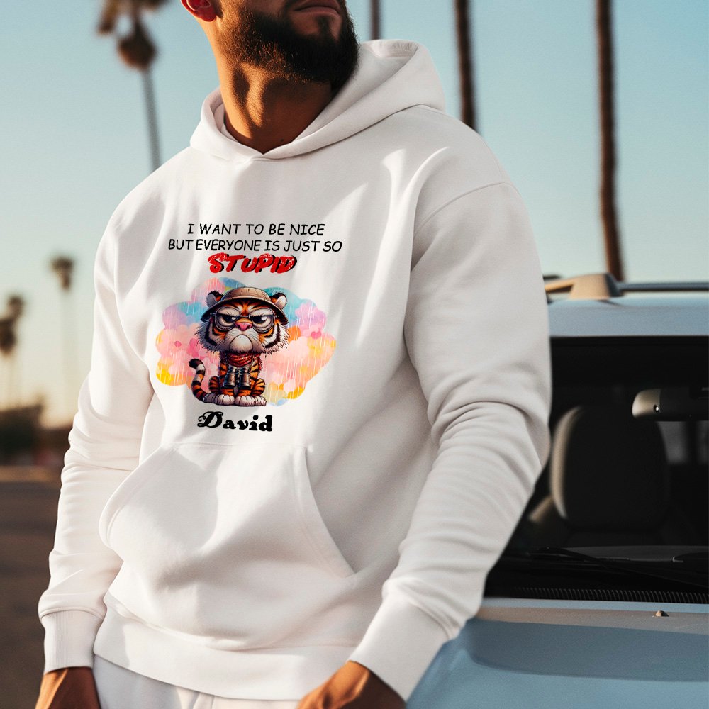 Our clothing design incorporates elements of grumpy animals, featuring angry expressions and exaggerated hair, which is both interesting and cute. The background is dreamy watercolour clouds, but it is raining heavily, forming a strong contrast effect, and the picture is full of dynamics and layers. "Admit it, life would be boring without me!" and other title choices, coupled with the customization of Personalised names, convey a strong personal attitude and emotional expression.
