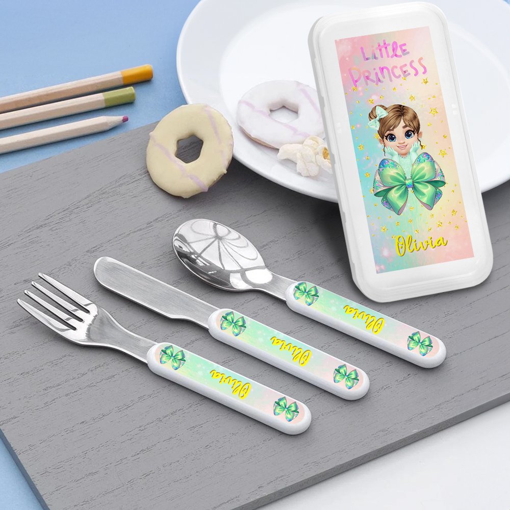 This customized cutlery set is the perfect dining accessory for little girls. Inspired by the theme of a tale, it features a cartoon little princess, colorful bow accents, sparkling stars, and vibrant background colors, making mealtime fun and imaginative for children. Additionally, the cutlery set allows for Personalised printing with your child's name, adding a special touch to their dining experience.