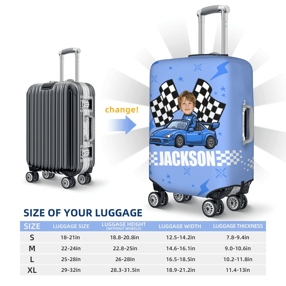 Featuring fun cartoon racing driver and car motifs, these covers let you customize your photo, name, and number to create a cool racer look, complemented by checkered flags, lightning bolts, and more.  Available in various background colors, making your suitcase instantly recognizable at the airport and eliminating the hassle of similar-looking luggage.