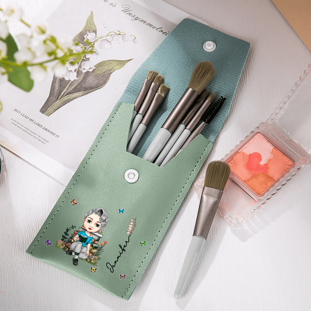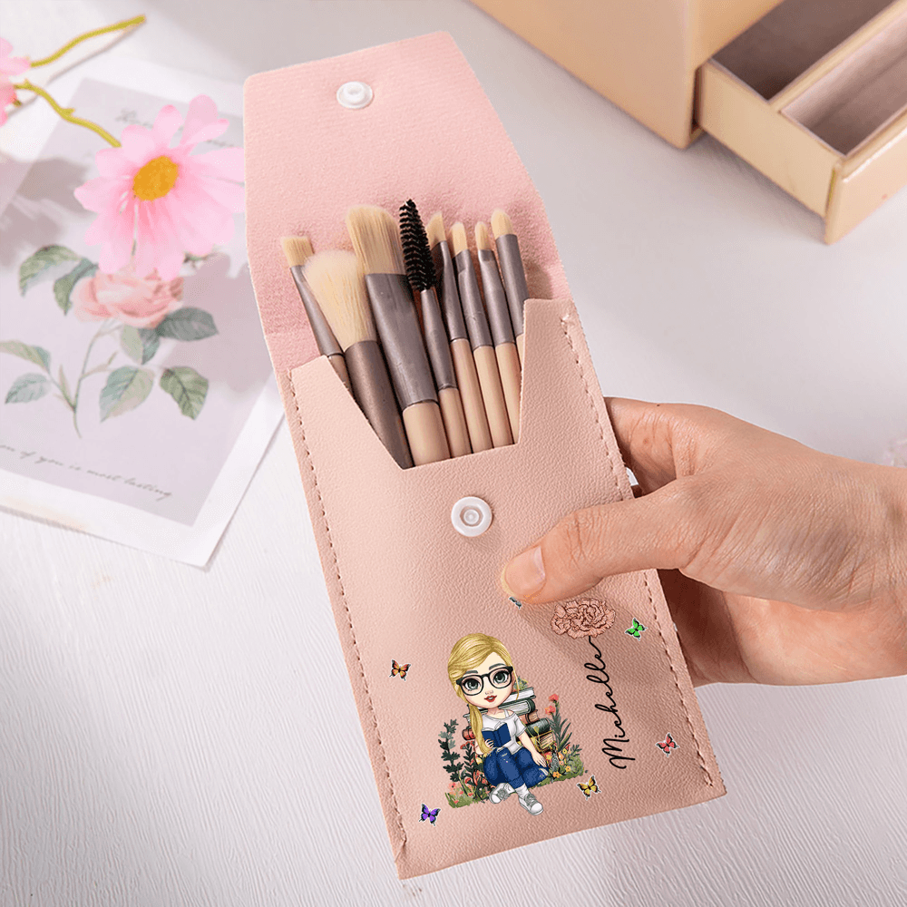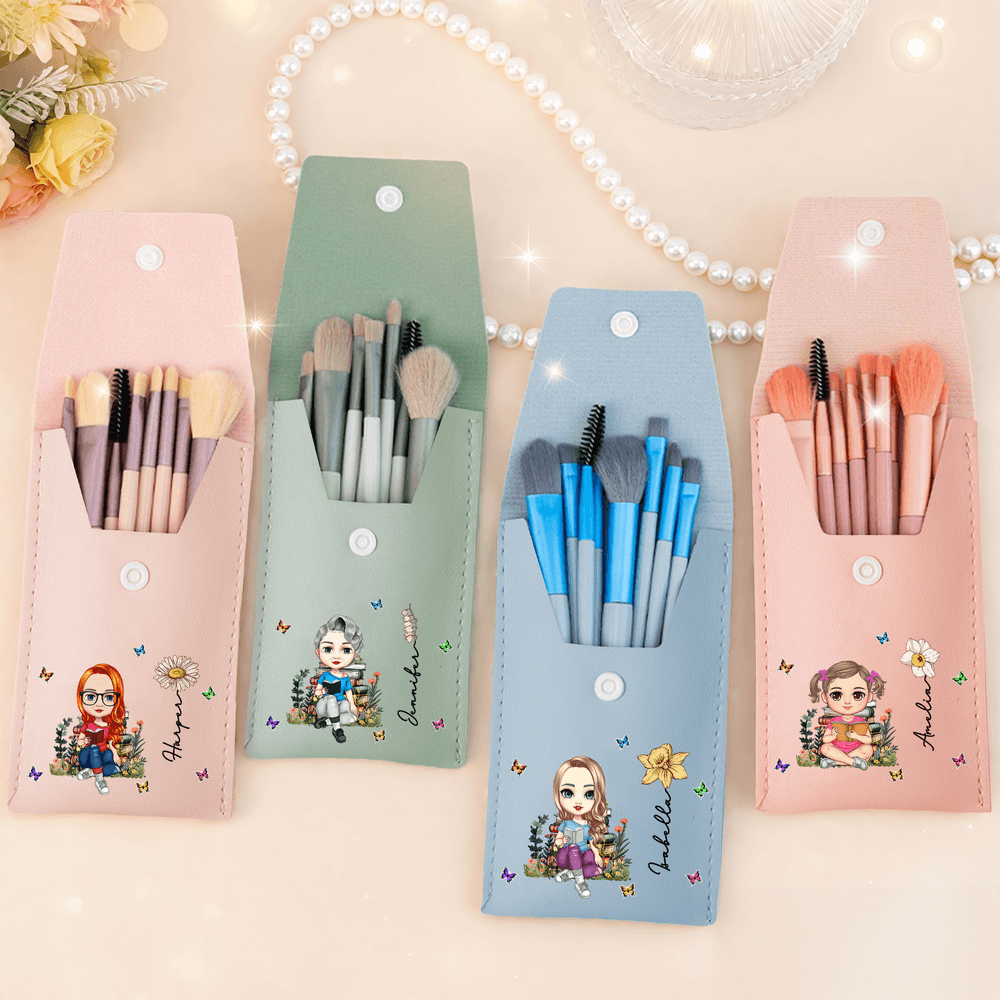 Personalised Cartoon Reading Character Birth Flower PU Leather Makeup Brush Bag Set with Name and 8 Pcs Makeup Brushes Birthday Gift for Women Girls