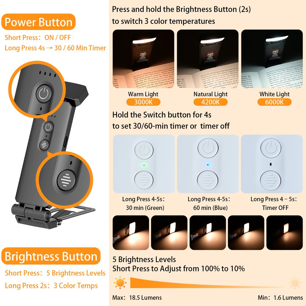 Featuring five brightness levels and three colour temperature adjustments, covering white light, warm light, and natural light, the LED light can be switched by pressing and holding for 2 seconds. A built-in 30/60-minute timer shuts off, protecting sleep and preventing battery waste. A 500mAh high-capacity battery supports 2-3.5 hours of TYPE-C fast charging and provides 8-80 hours of continuous use at minimum brightness, ensuring worry-free emergency use and maximizing practicality.