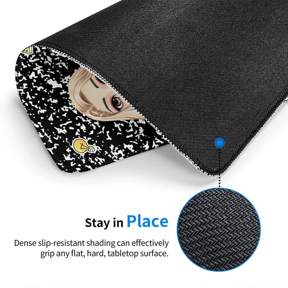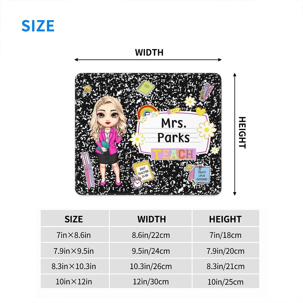 This mouse pad features a one-of-a-kind customized cartoon teacher character design, where each illustration incorporates Personalised expressions. Adorned with a speckled background and vibrant elements like rainbows, flowers, pencils, and notebooks, it adds a splash of color to your desk. Choose from 8 different mouse pad colors to suit your preference. You can also Personalise it with a custom title and name, reflecting your unique personality.