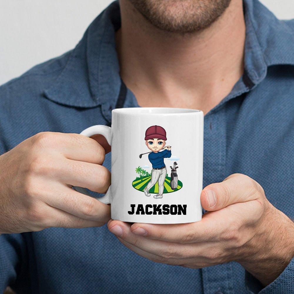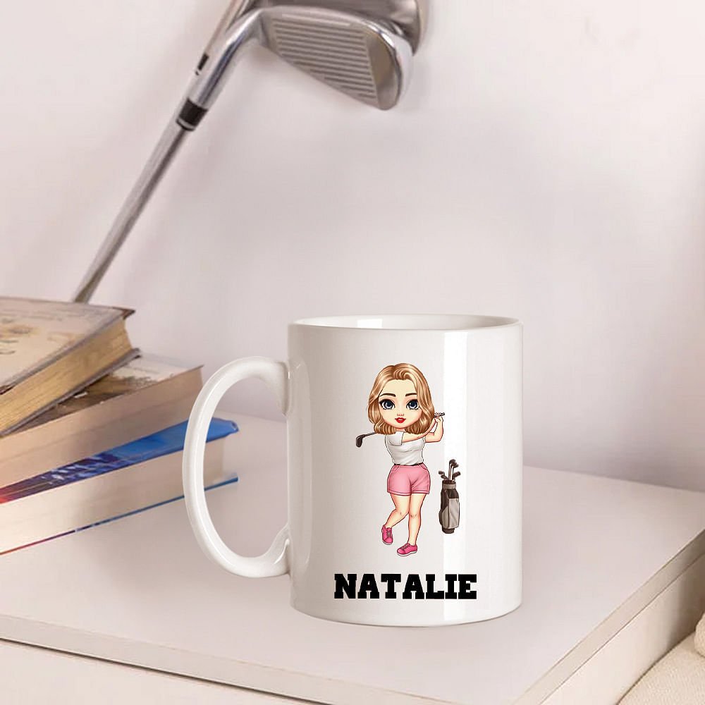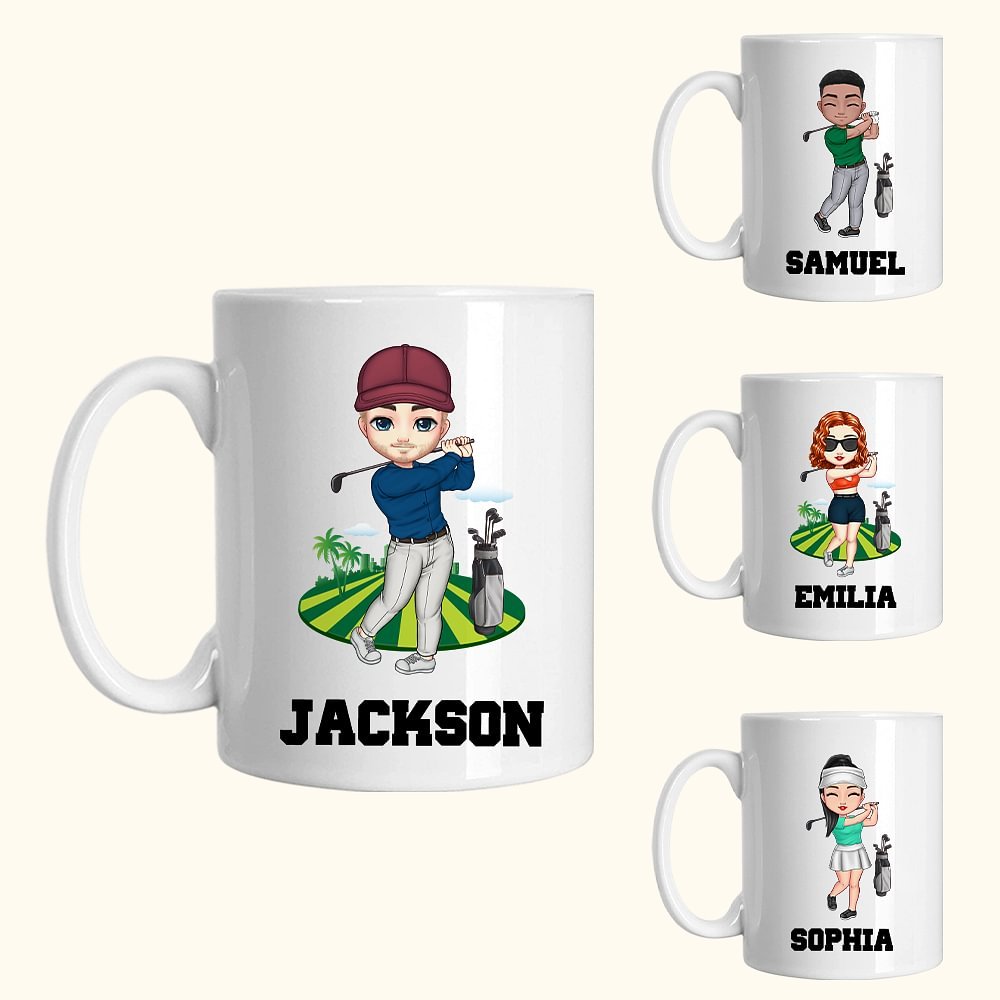 This mug is perfect for any golf lover. It features a whimsical golf-themed cartoon character and is customizable with a name. The playful design, showcasing golfers in action or celebrating a win, makes it a unique and memorable gift for any golf event.