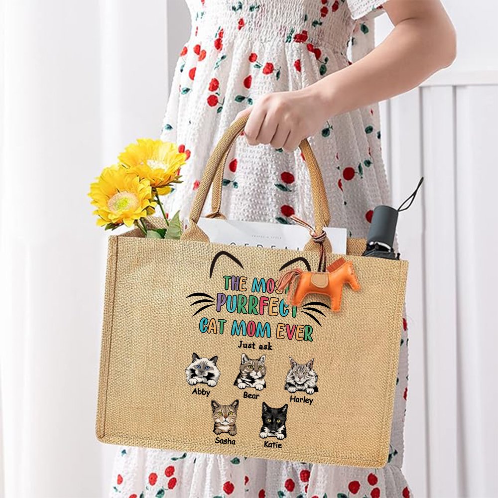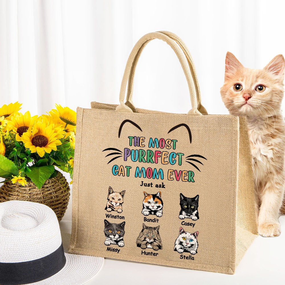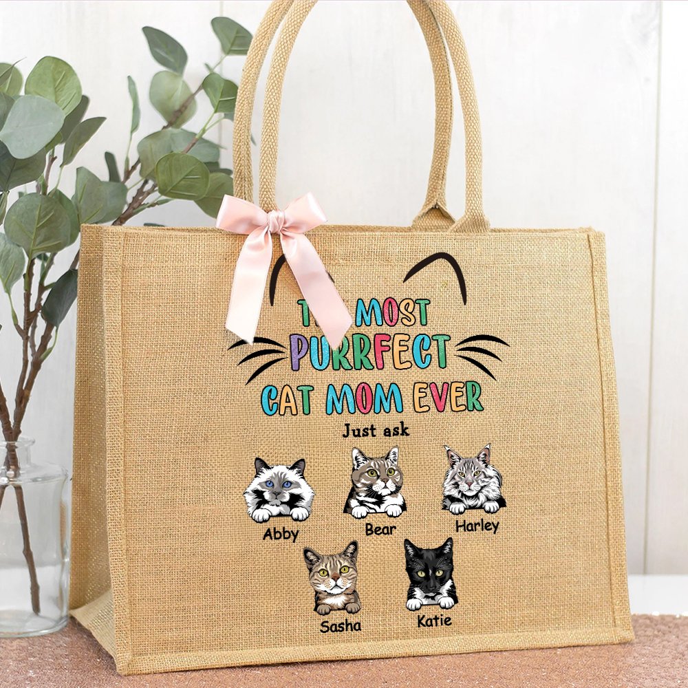 Personalised The Most Purrfect Cat Mom Ever Jute Tote Bag with 1-6 Cat's Name Large Capacity Birthday Travel Accessory Gift for Cat Lover