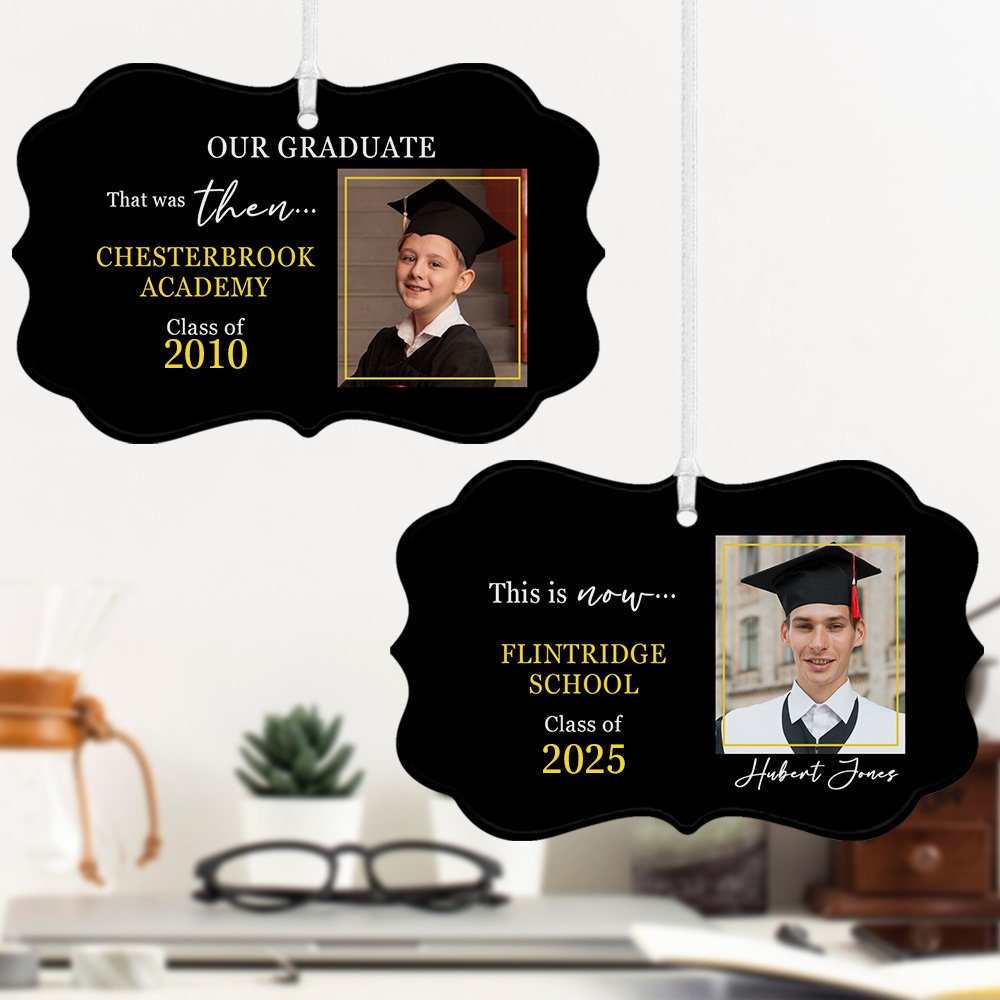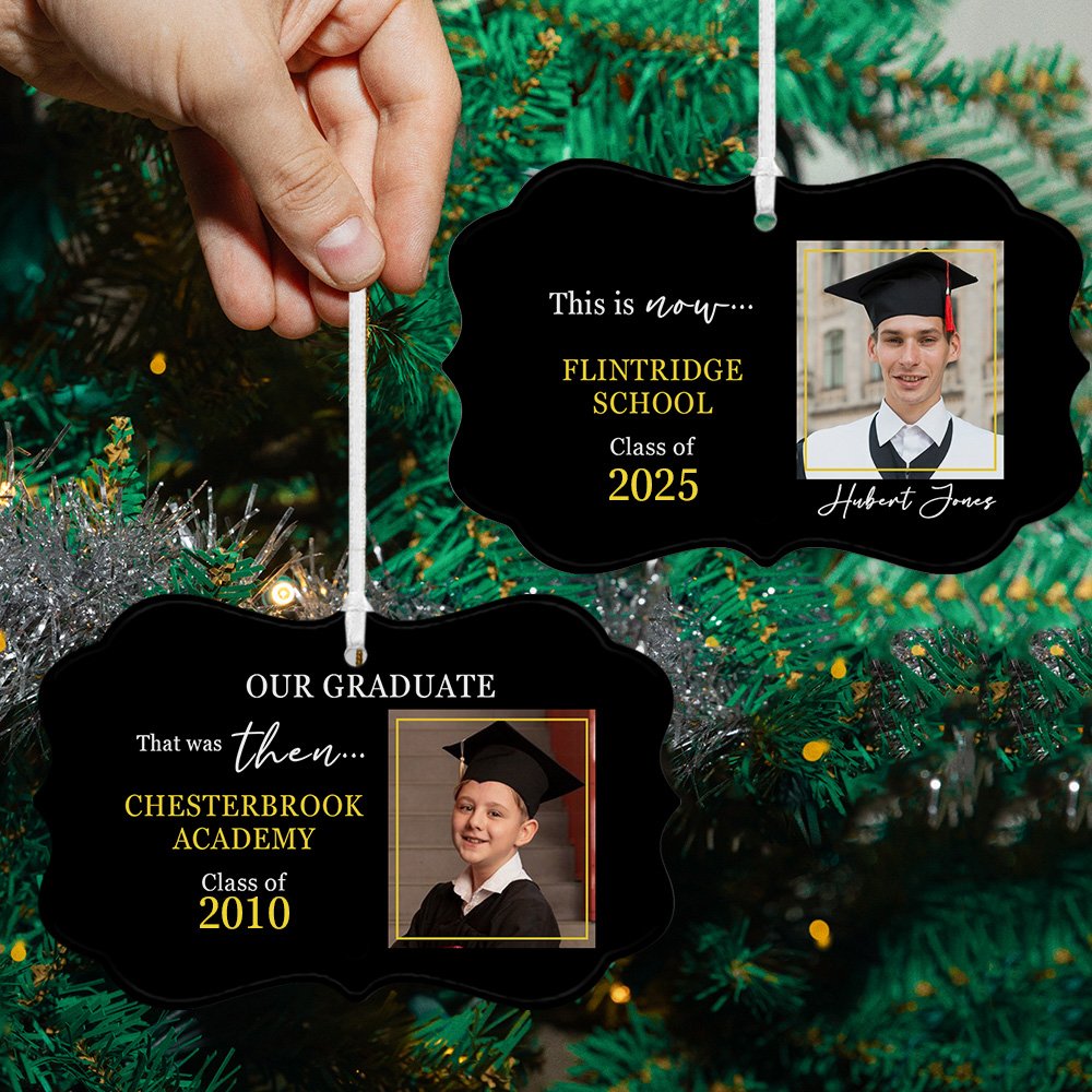 The ornament features an name tag, school names, and graduation years, ensuring your accomplishments are beautifully commemorated in a timeless and elegant design.