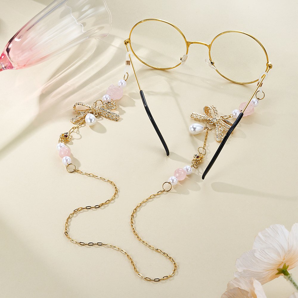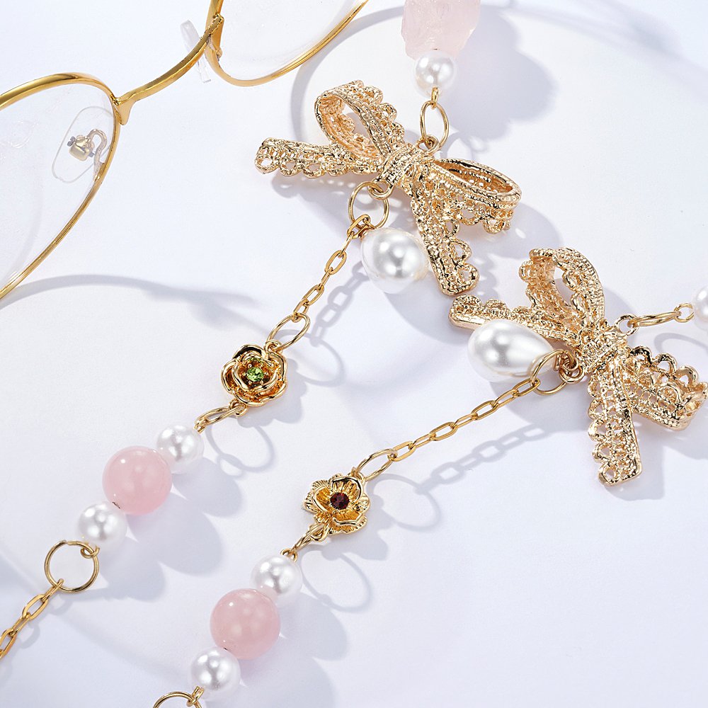 Exquisitely crafted with great attention to detail, this eyeglass chain features a bow charm with a beautiful combination of an array of stunning pearls. The harmonious color palette and sophisticated design are inspired by the essence of flirtatious aesthetics, ensuring you carry your eyeglasses in fabulous style.