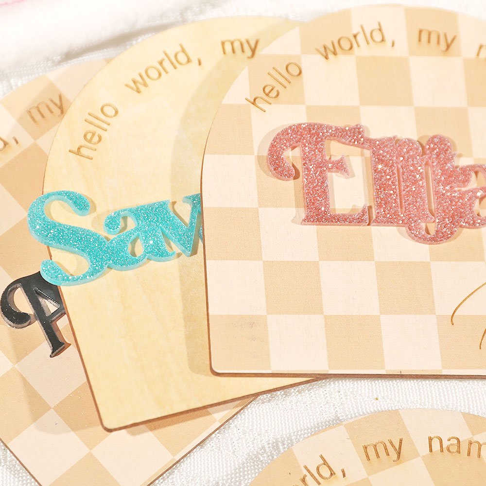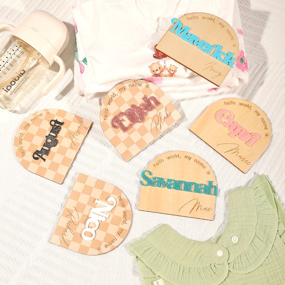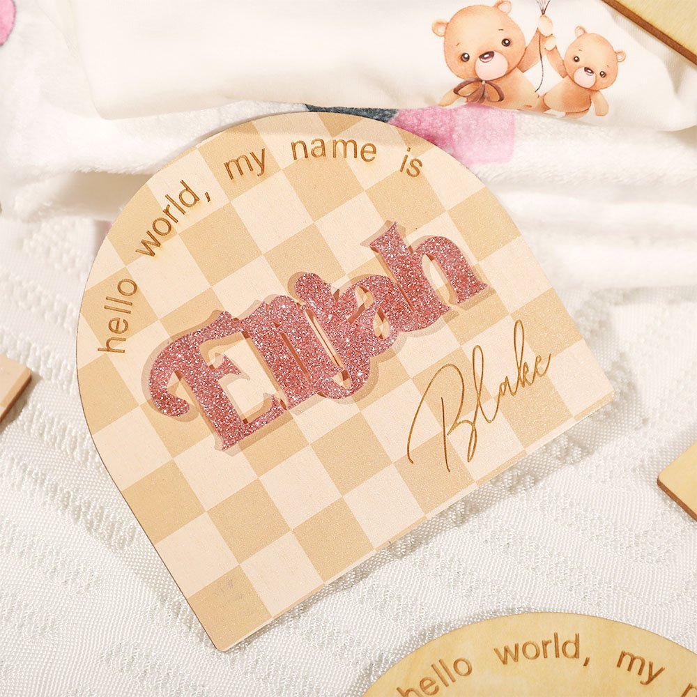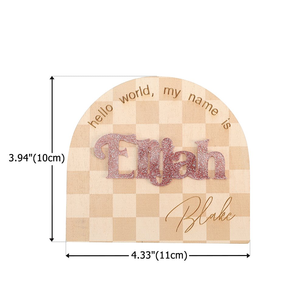 Celebrate the arrival of your little one with this charming baby birth announcement sign. Customize it with your baby's name to create a one-of-a-kind keepsake. The sign is available in classic wood and checkered patterns, perfect for any nursery or photo shoot.
