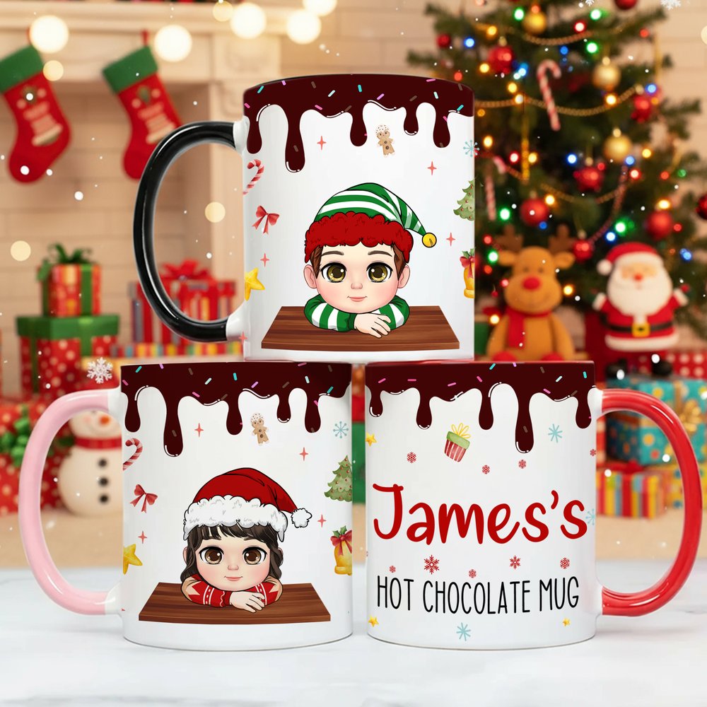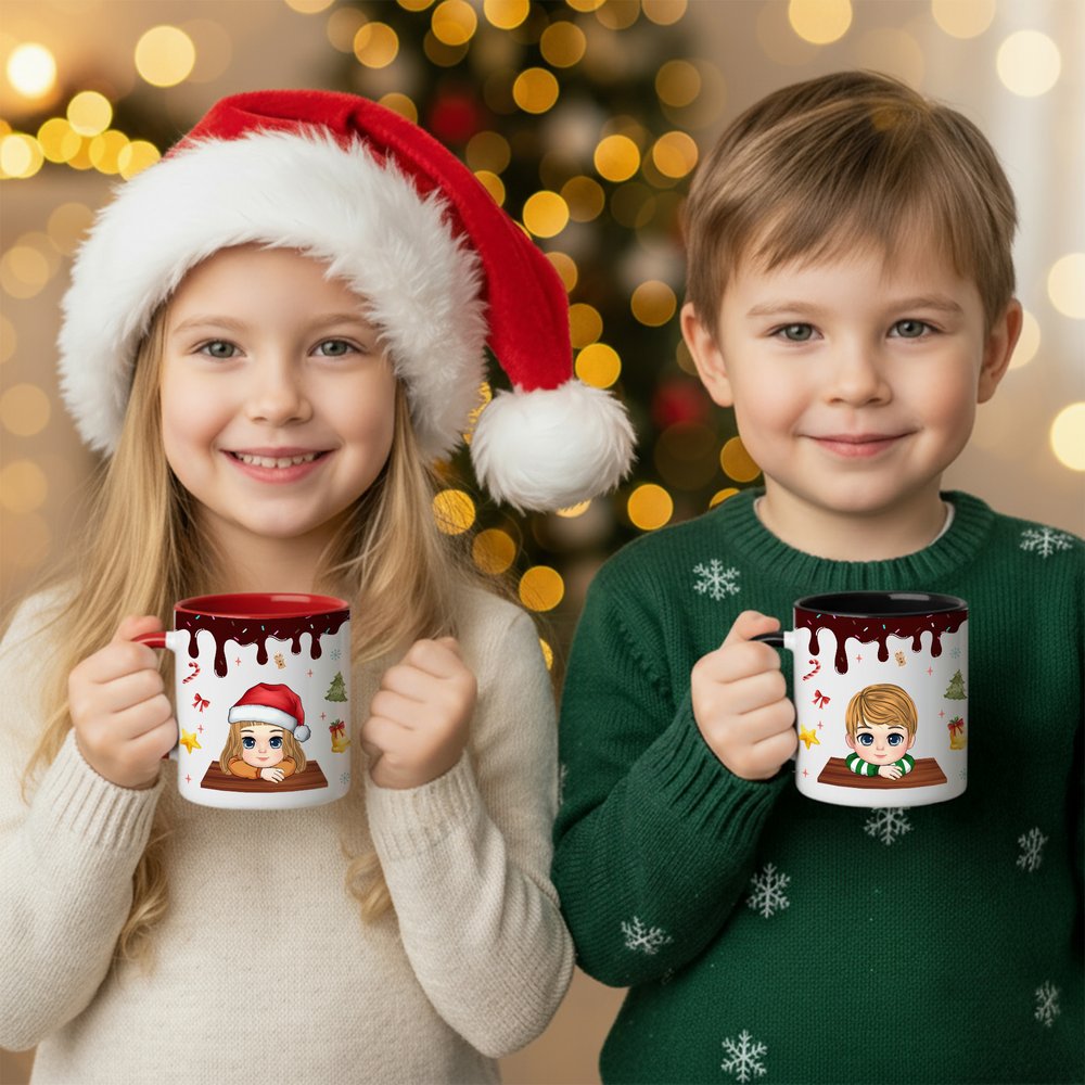 The top of the mug simulates a flowing chocolate sauce effect, adding a touch of sweetness. The main body features adorable Christmas characters wearing classic Santa hats and lively eyes, conveying festive joy. The surrounding area is decorated with vibrant and harmonious Christmas motifs, including Christmas trees, snowflakes, and stars. Customizable names make the mug unique and instantly evoke the festive atmosphere.