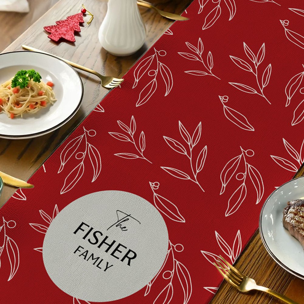 This table runner features beautiful Christmas leaves for a seasonal touch, and with a choice of red or green, it embodies the Christmas spirit. Customizable with your family name, it symbolizes warmth and togetherness, making every holiday meal feel special.