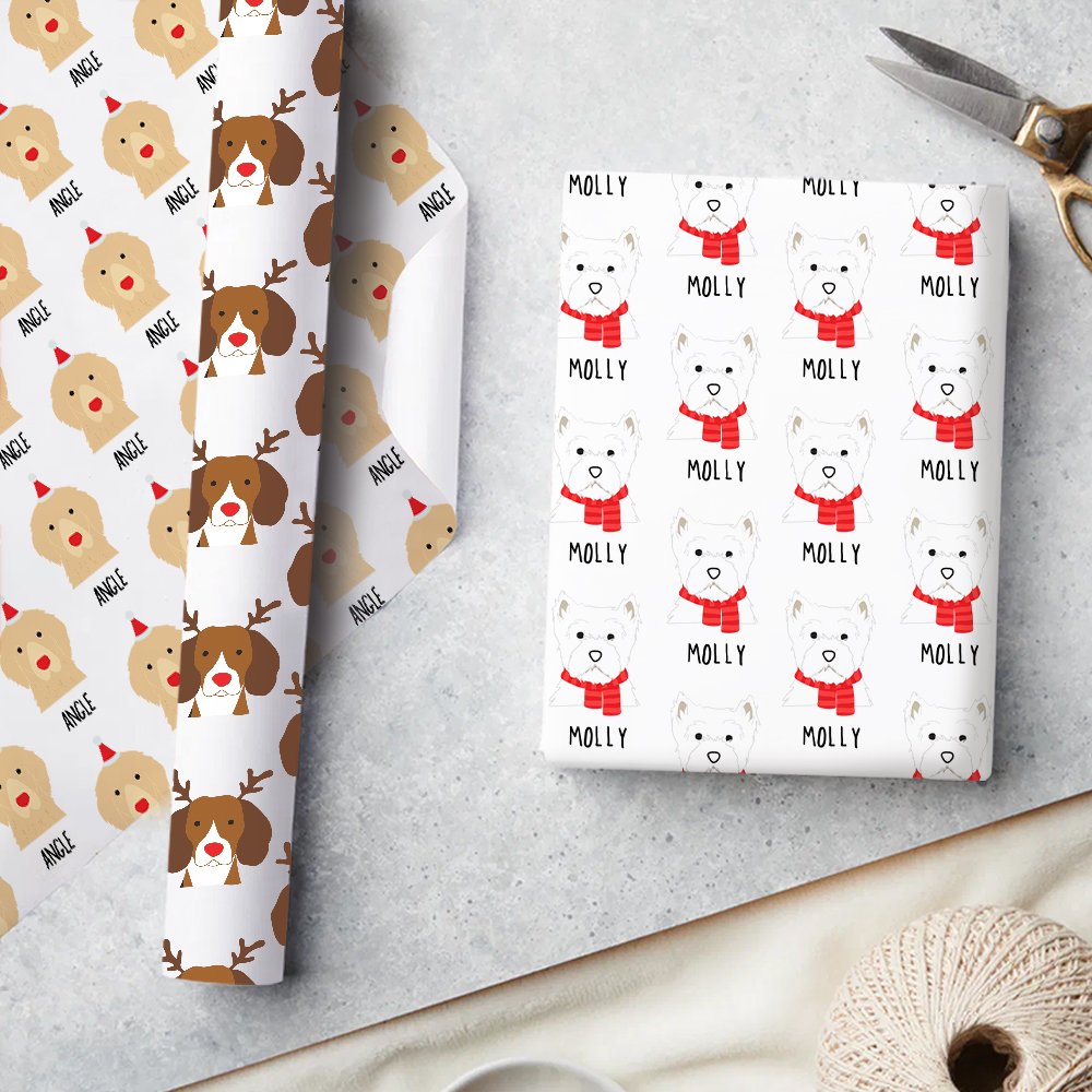 You can choose your favorite cartoon dog image on the wrapping paper, wearing antlers or a Santa hat or scarf. You can also include the dog's name for a special personal touch, making each wrapped gift stand out under the Christmas tree.