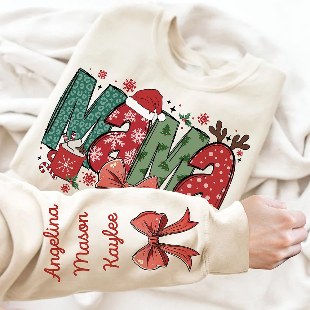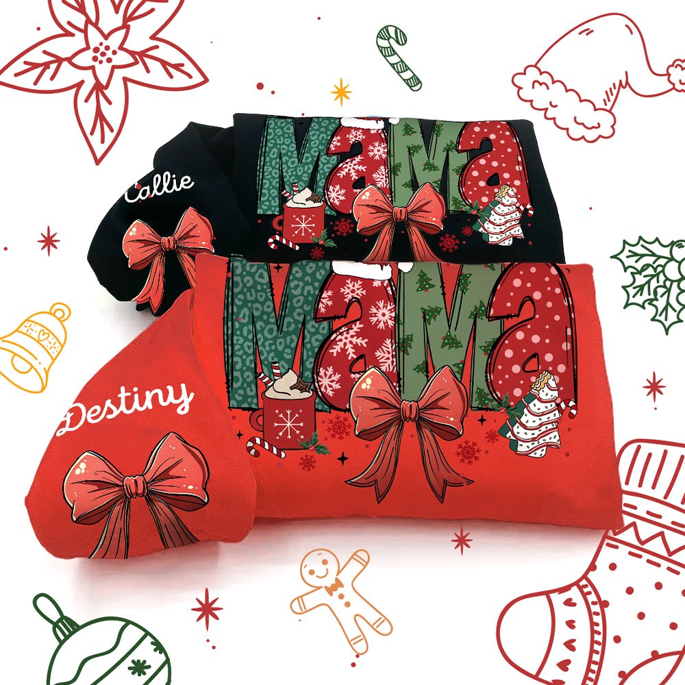 This clothing creates a fun and elegant look by combining Christmas elements, such as a Santa hat, coquette bow, snowflakes, deer antler, and Sweets cane. It's a design that immediately captures the essence of the Christmas spirit and brings a touch of festive cheer. The addition of "Mama" and a Personalised name makes it a truly one-of-a-kind gift for moms. It's the perfect way for her to celebrate Christmas in style.