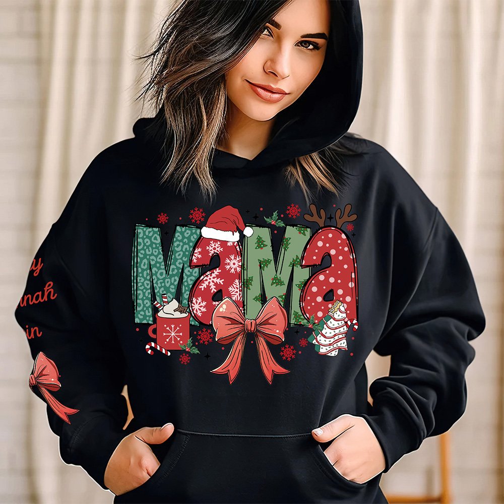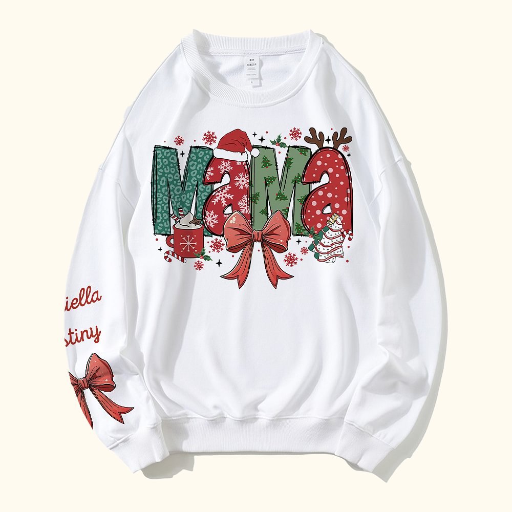 Personalised Christmas Theme Santa Hat Coquette Bow Snowflake Mama Sweatshirt Hoodie with 1-6 Names Christmas Festival Gift for Mom