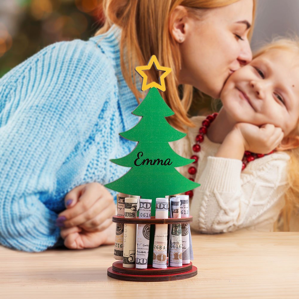 Personalised Christmas Tree Freestanding Wooden Money Holder with Text Christmas Gift for Kids Family