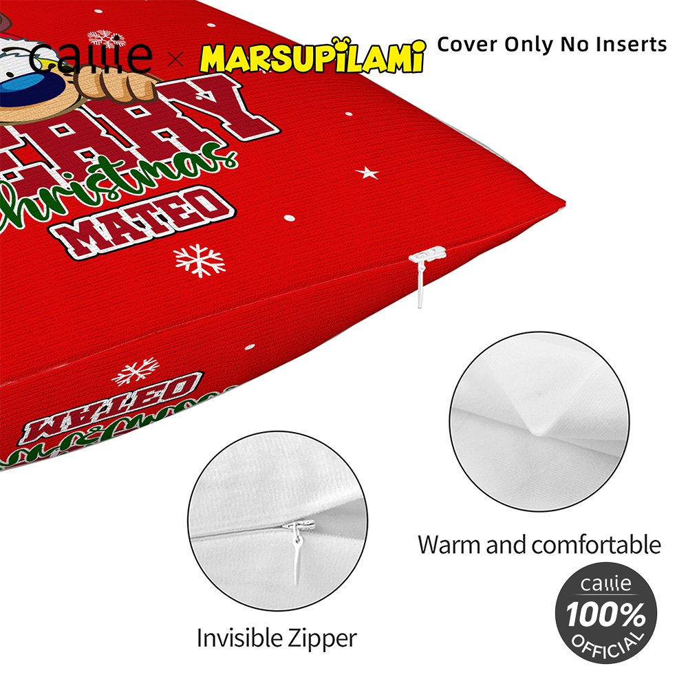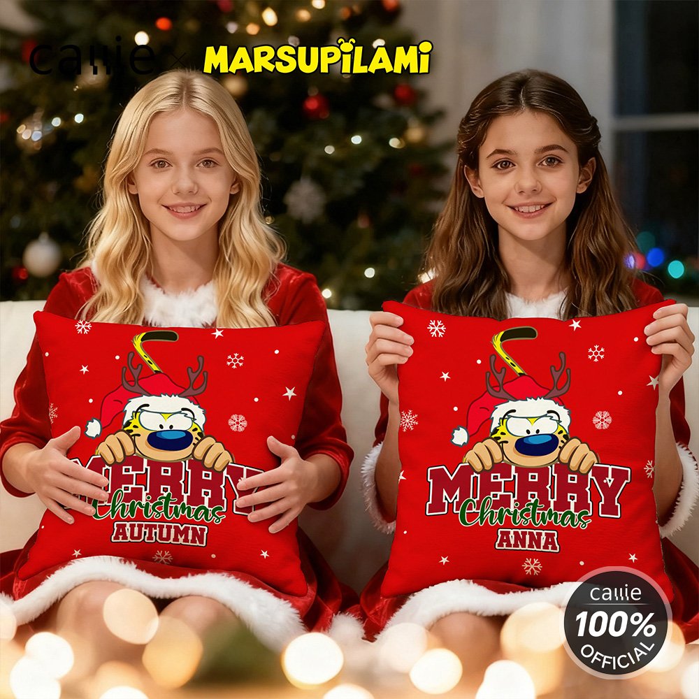 Design around the cute cartoon image pattern of Tail-Bouncing Matthew, which was created by Belgian cartoonist André Franquin in 1952. Marsupilami is a jungle-dwelling creature with yellow fur, black spots, and a super flexible, long tail. Adorned with Christmas hats and snowflakes, and with the option to customize names, each pillow becomes a unique item.