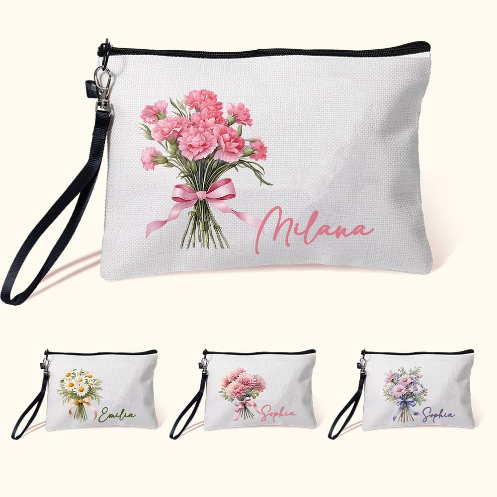 The design of this stylish makeup bag is simple and eye-catching. The makeup bag is printed with elegant birth flowers, which you can choose according to the birth month. You can also customize the name on the bag to make it more personal.