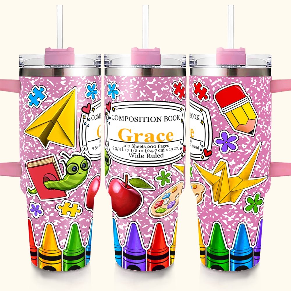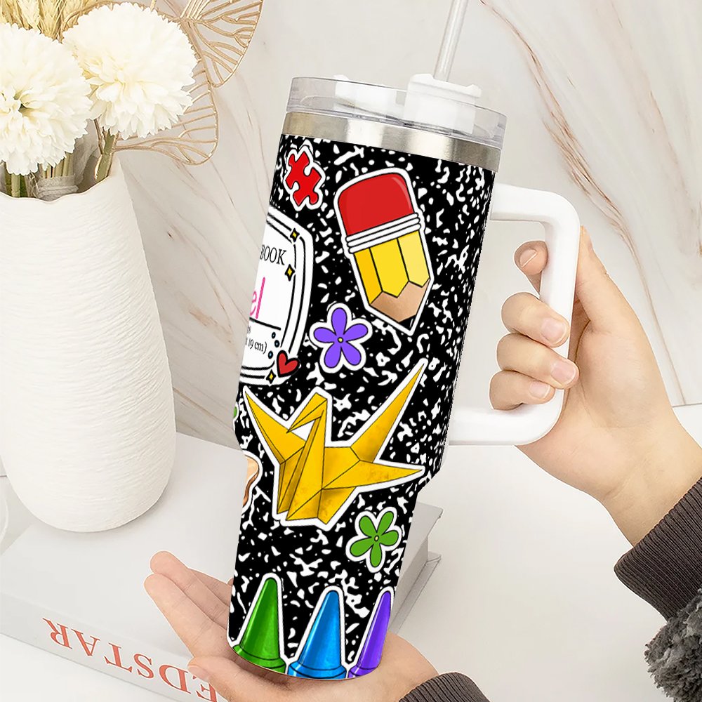 This tumbler features a lively composition book cover design, fully printed with bright colours and classic elements like crayons, apples, books, and pencils. The playful visual appeal is further enhanced by the option to customize it with the teacher's name, creating a fun and Personalised gift.