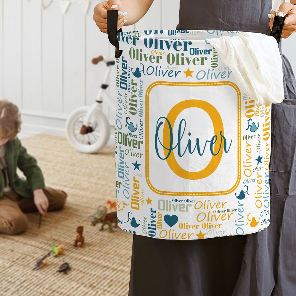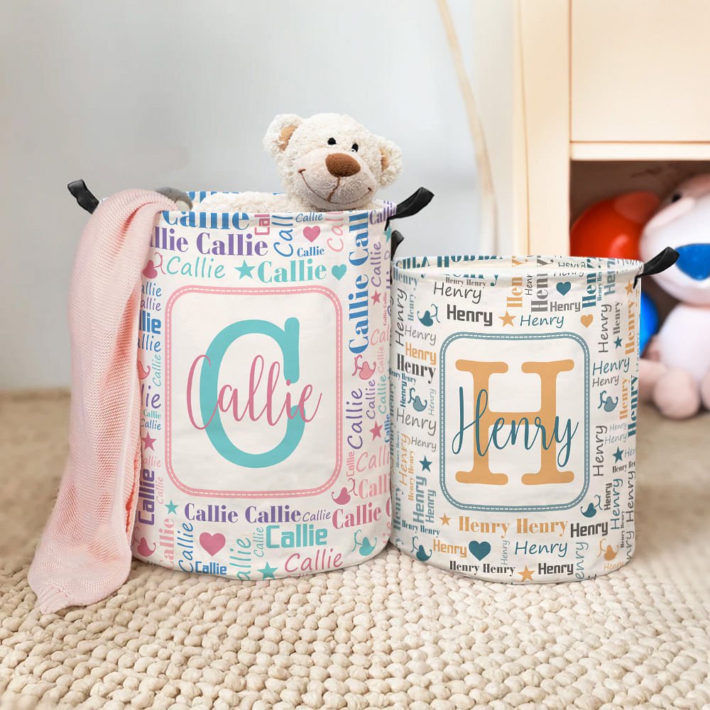 This laundry storage basket features a playful and colorful word cloud design that showcases your child’s name and initial creatively. The bright colors and fun patterns make it an eye-catching addition to any room. Personalization adds a special touch, turning a simple storage solution into a cherished keepsake.