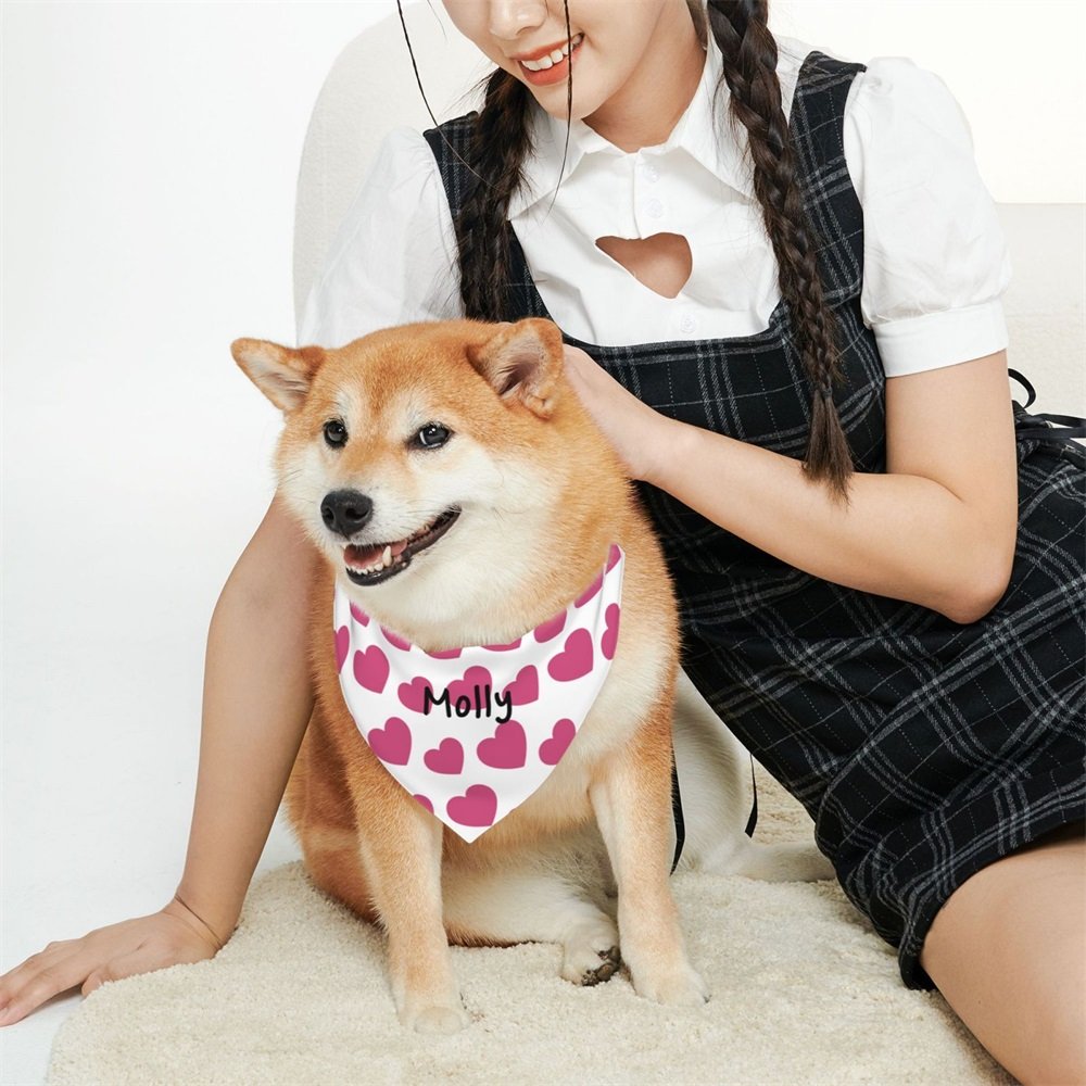 This charming bandana is designed with a vibrant and eye-catching love heart pattern, available in three colours, perfect for adding a pop of colour and style to your furry friend's wardrobe. You also can Personalise your pet's name in it, customizable on both sides. Let your pet strut their stuff in this fashionable accessory that will surely make heads turn at the park or on Valentine's Day!