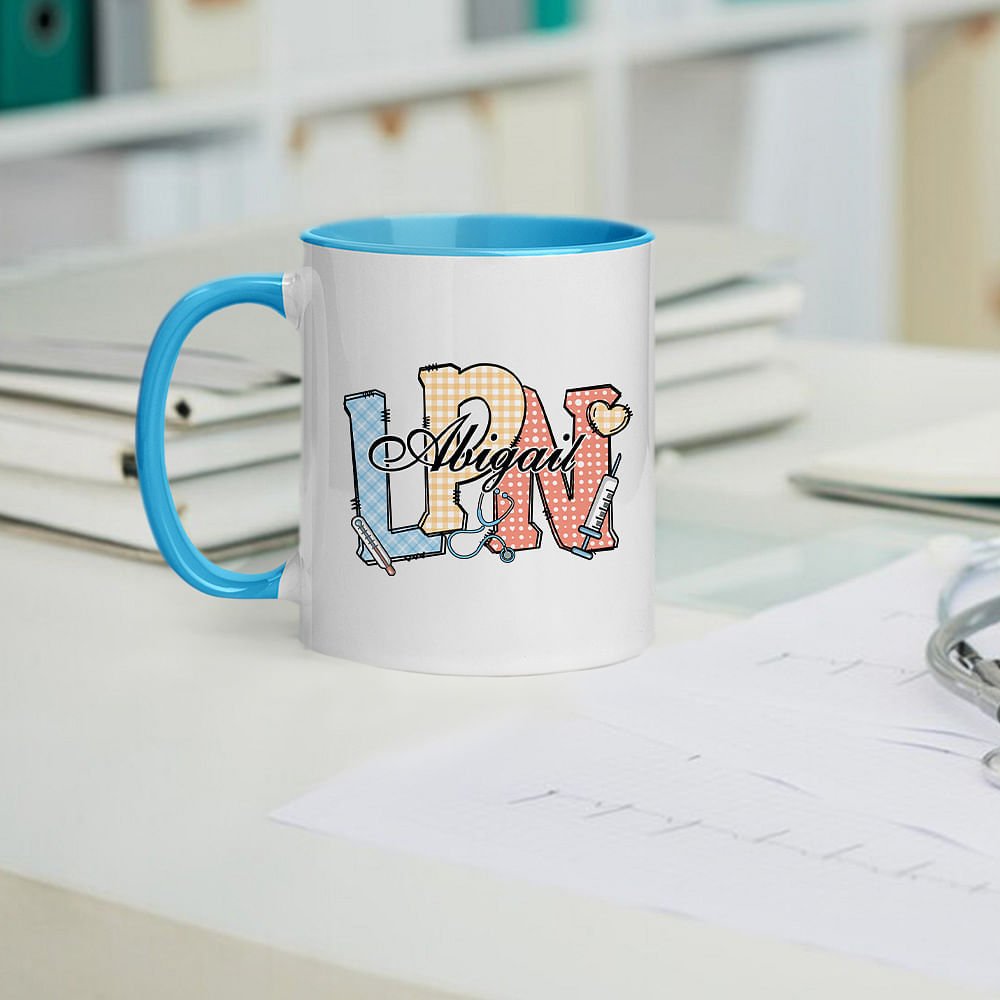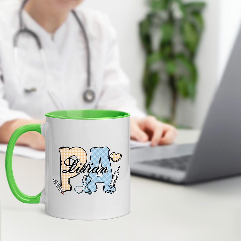 Personalise this colorful mug with your name and title. You can also add a unique design of medical equipment, such as a stethoscope and thermometer, to the mug.