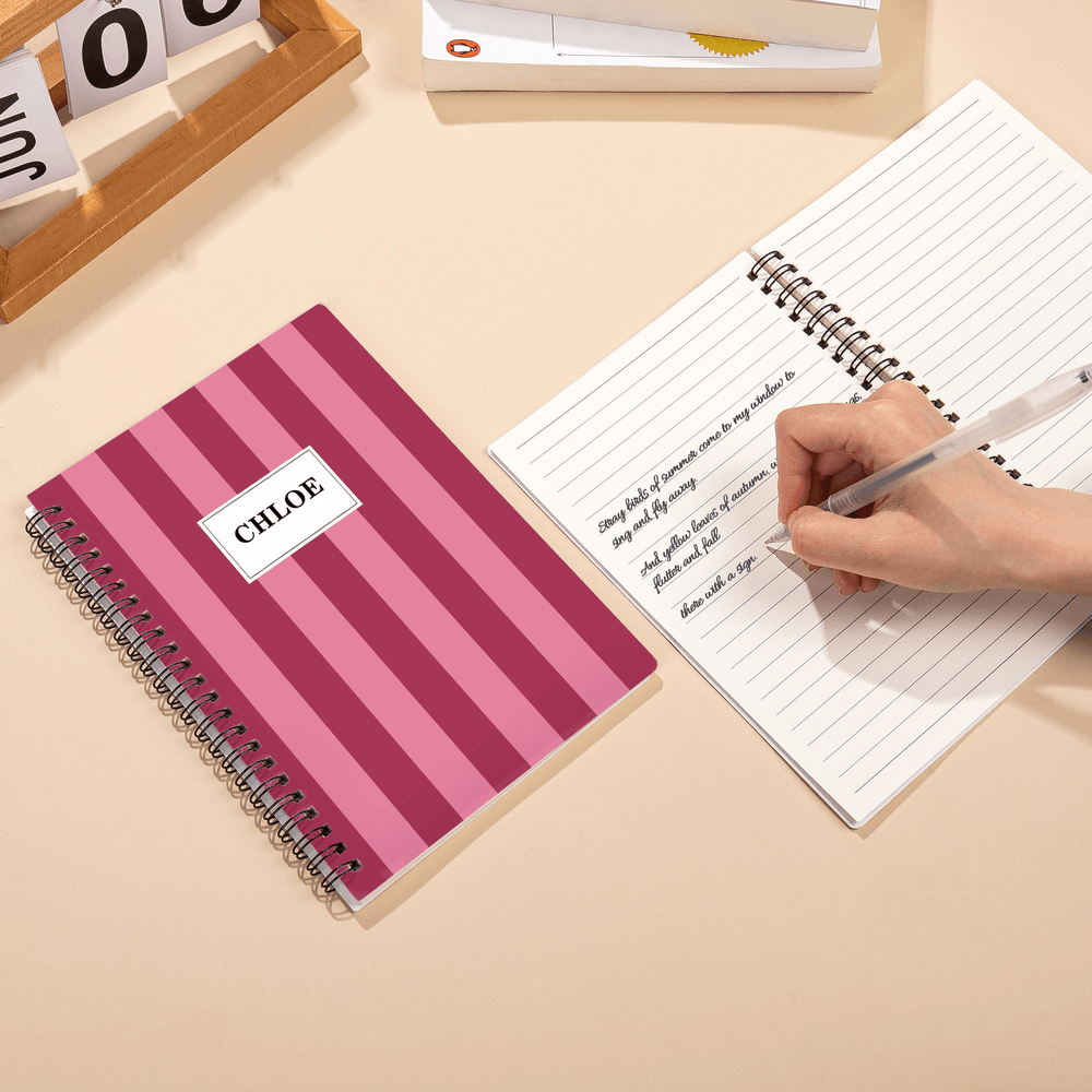 This notebook features a unique striped design that blends fashion with distinctiveness. Available in a range of soothing colors—gentle pink, fresh green, and vintage brown—it offers a minimalist yet standout style. Personalise it with a name and text to make each notebook uniquely yours. More than just a practical tool for notes, it’s a statement accessory that reflects your taste.