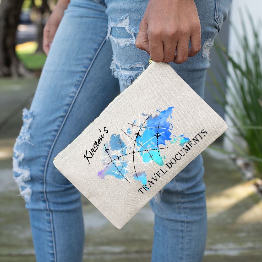 The bag features an elegant gold zipper, adding a touch of sophistication to your travel ensemble. The Personalised text on the bag make it easy to spot in your luggage, ensuring you never misplace your important documents again.