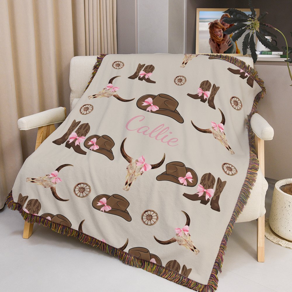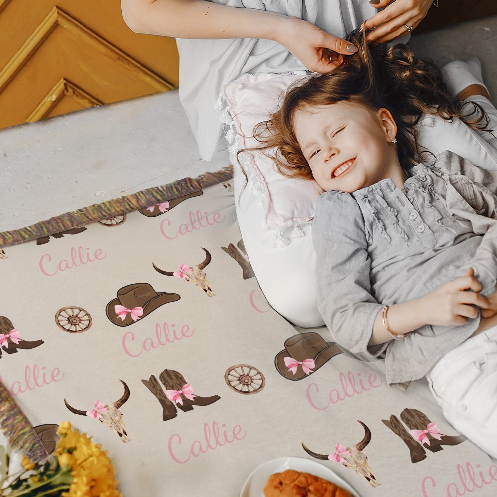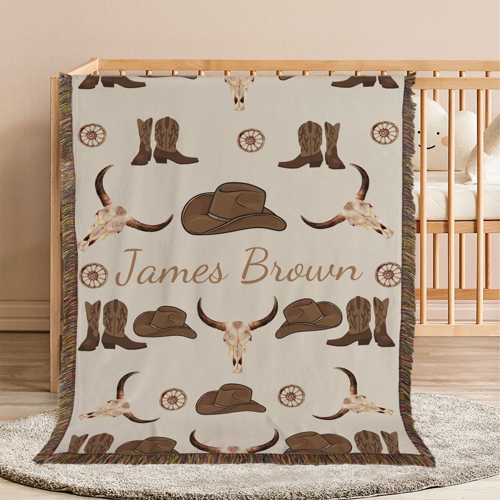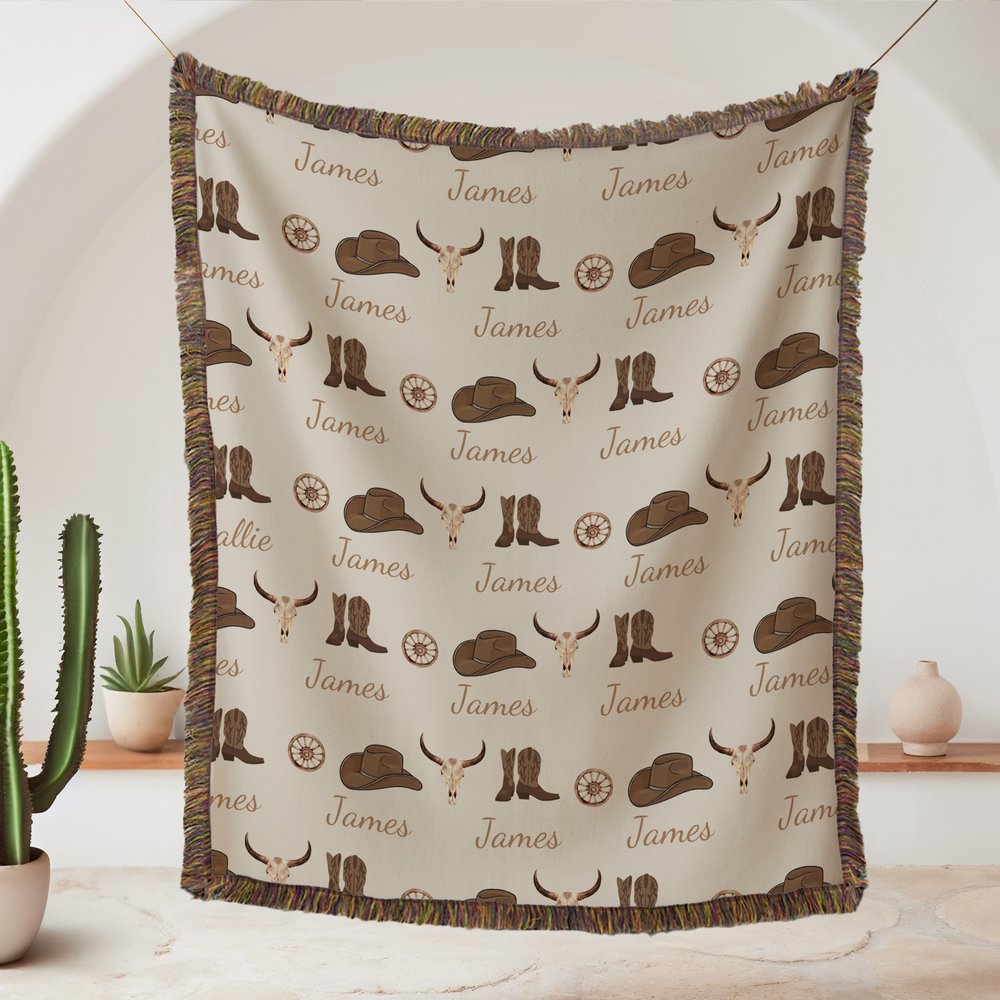 Embracing classic Western elements like the cowboy hat, boots, and cow skull, this blanket captures the authentic spirit of the Wild West. Personalised with a custom name and accented with fringe detailing, it exudes rustic charm and individuality. Each piece is uniquely crafted to celebrate your love for Western style, making it a one-of-a-kind statement of frontier flair.