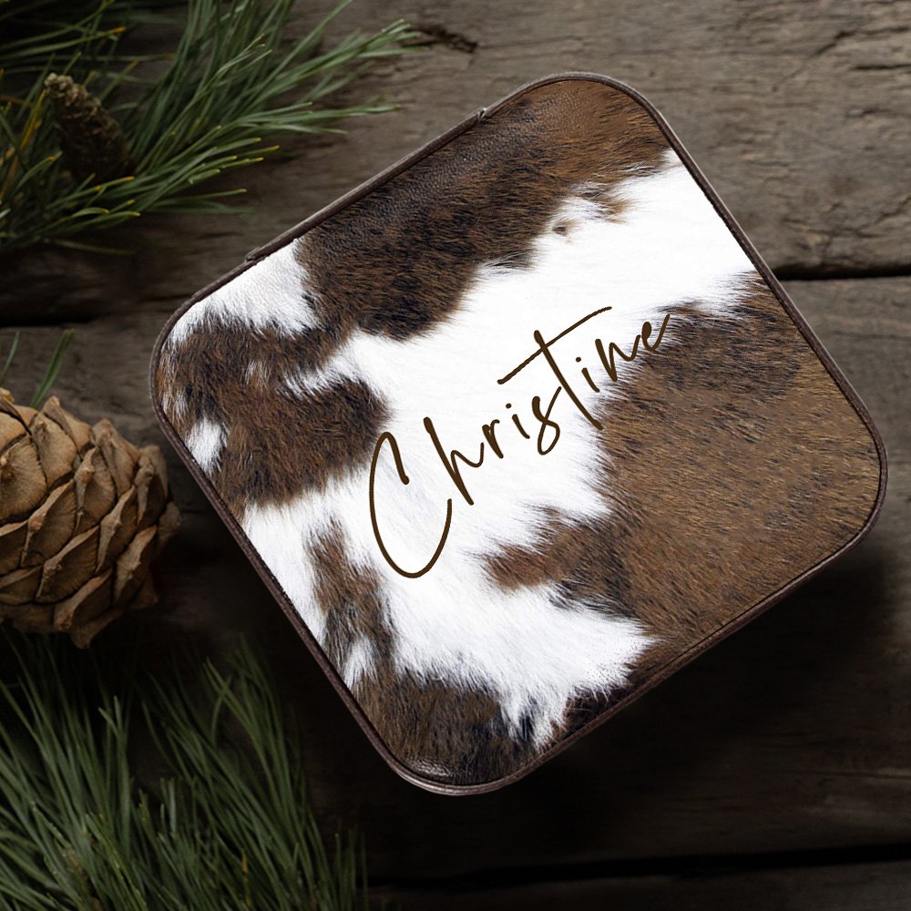 This is a cowhide fur pattern jewellery box, giving people a warm feeling, there are eight fur styles to choose from and five fonts for customizing names. People who like ranches, cowboys, and cattle should not miss it. The cow fur element adds a warm feeling to the jewellery box, symbolizing courage, strength, and maternal love.