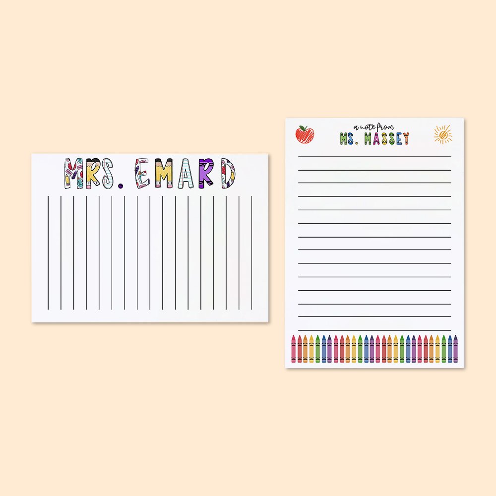 This notepad features a playful crayon font to display the teacher's name. It includes elements such as an apple and the sun, perfectly representing teachers' nurturing and educational role, making it an ideal gift to express gratitude.