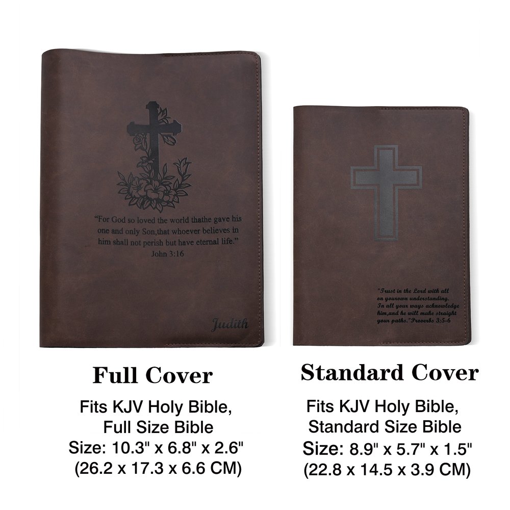 This exquisite Bible cover features a sacred cross design, perfectly blending spiritual symbolism with contemporary style. Available in 35 distinct cross patterns, you can select your favorite motif. The classic brown hue exudes timeless vintage charm. Additionally, Personalise the cover with your most cherished Bible verse and your name, offered in 9 font styles, allowing you to proudly proclaim your faith while expressing individuality.
