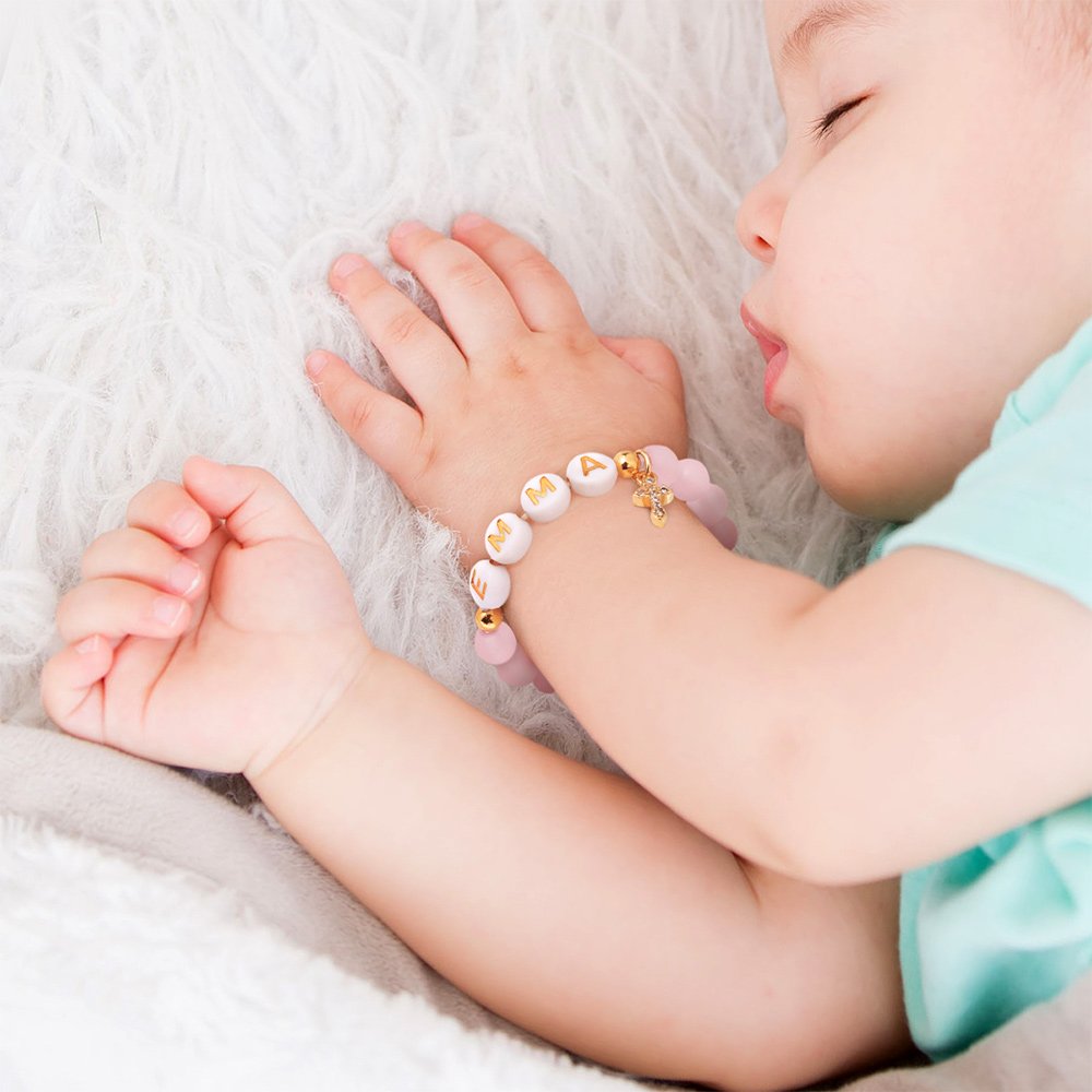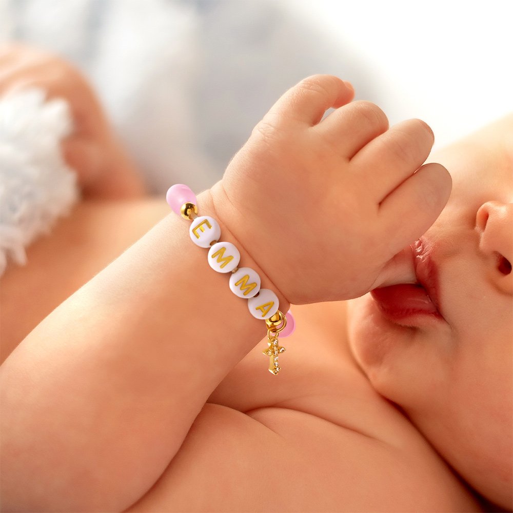 This bracelet can be customized with a baby girl's name, making it a unique and sentimental gift. It adds a personal touch, perfect for commemorating her arrival and creating lasting memories. The cross design is significant in the Christian faith, making it a thoughtful and meaningful symbol of faith and blessing for a newborn.