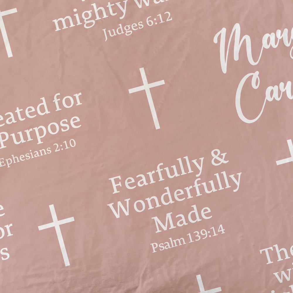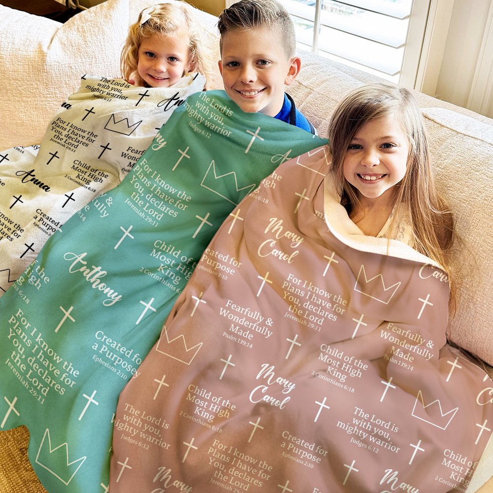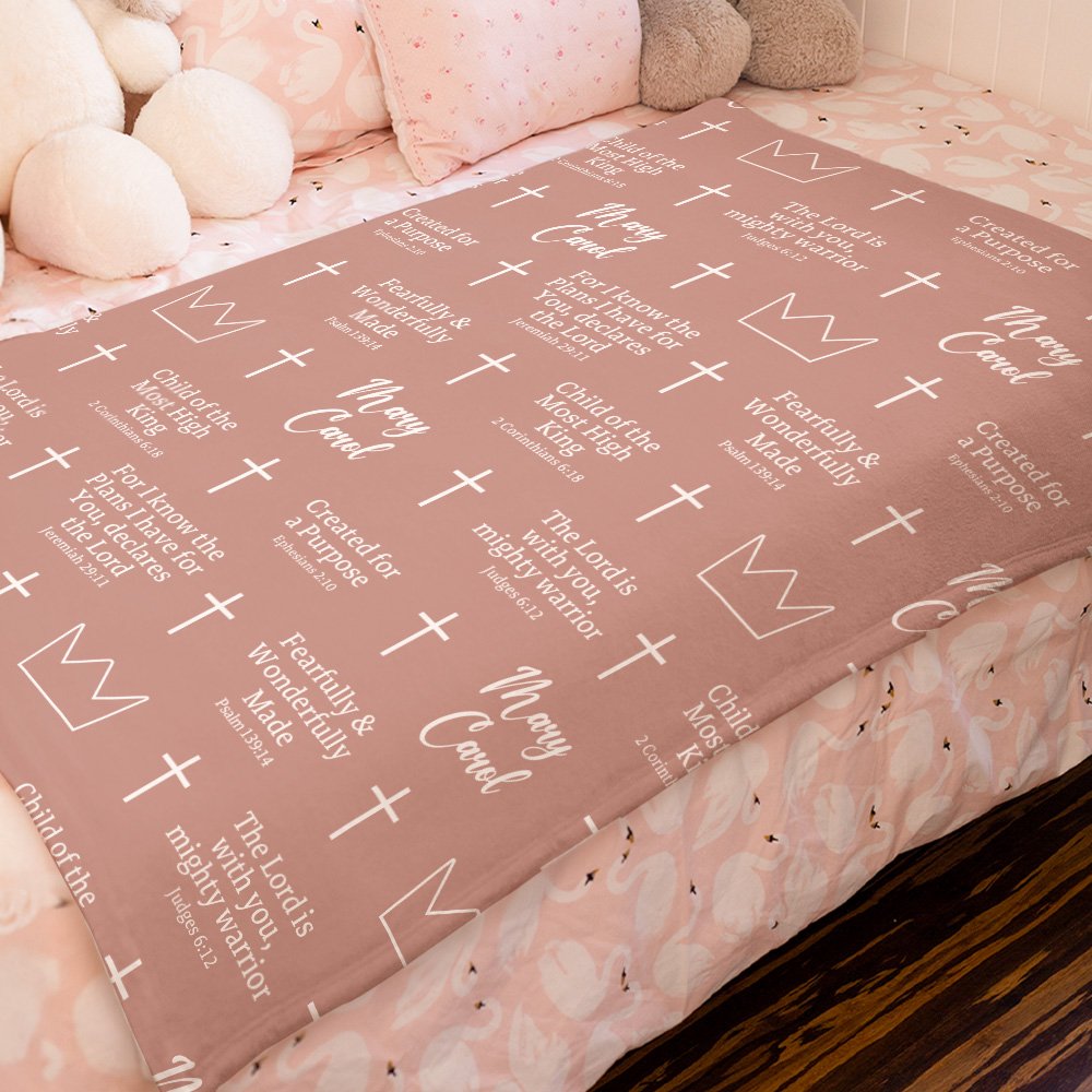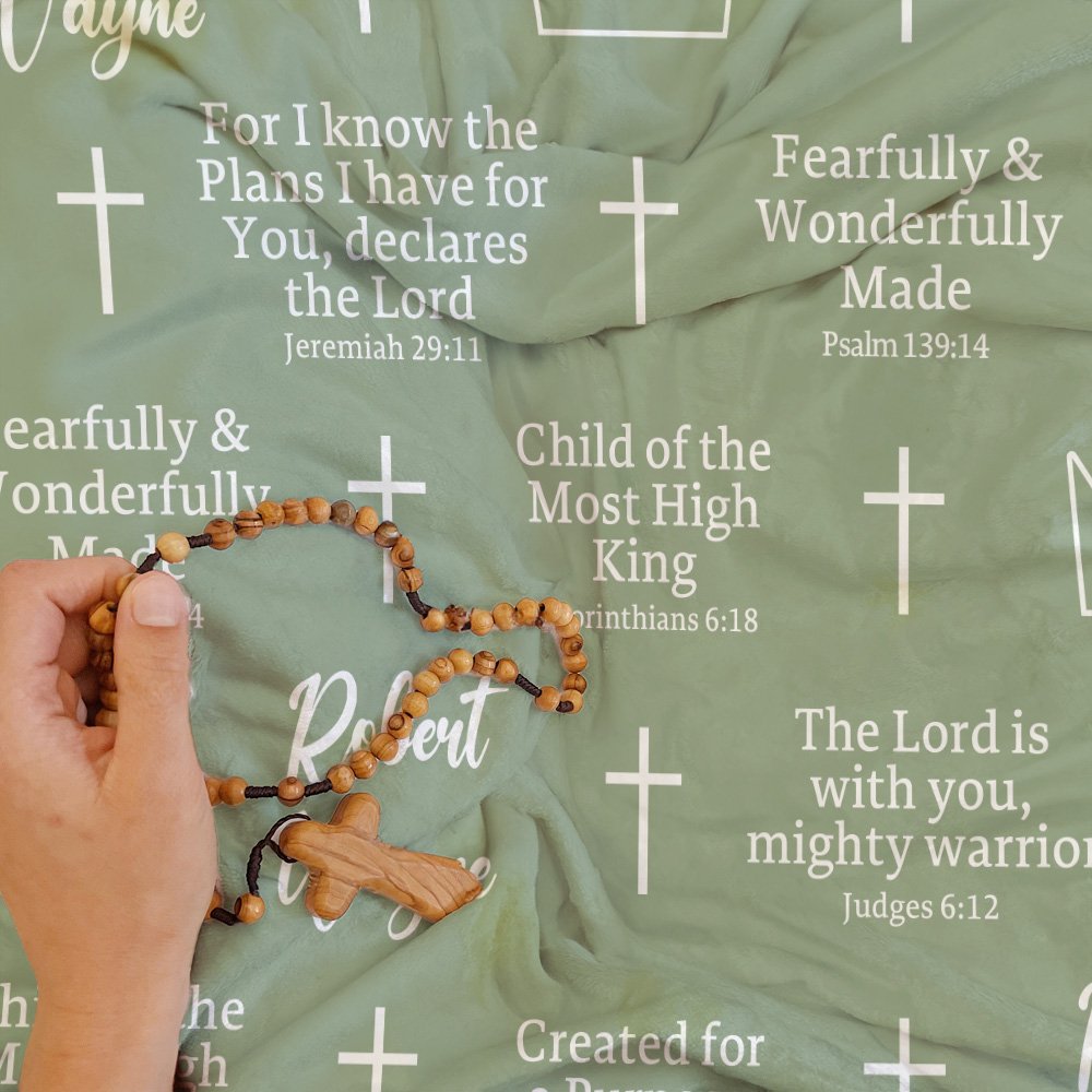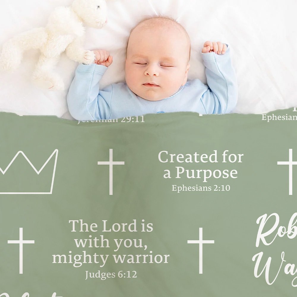 This blanket perfectly combines faith and personalization. The blanket is carefully printed with the baby's exclusive name, paired with inspiring Bible verses, and each sentence contains beautiful meanings and blessings. In addition, it also incorporates Christian pattern elements such as crosses and crowns. The overall design is both warm and full of religious and cultural connotations, bringing a unique visual experience and spiritual nourishment to the baby.
