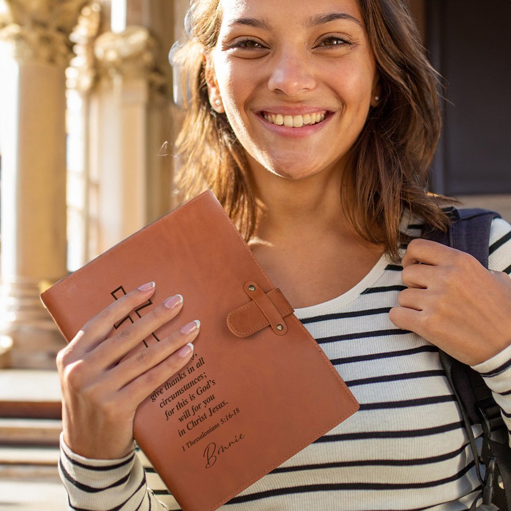 This leather sketchbook cover features the uplifting message "Rejoice Always, Pray Continually, Give Thanks in All Circumstances; for this is God's Will for You in Christ Jesus." Accompanied by a beautifully fixed cross, it is a daily reminder of faith and gratitude.