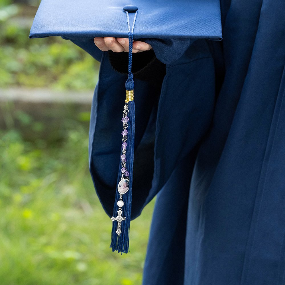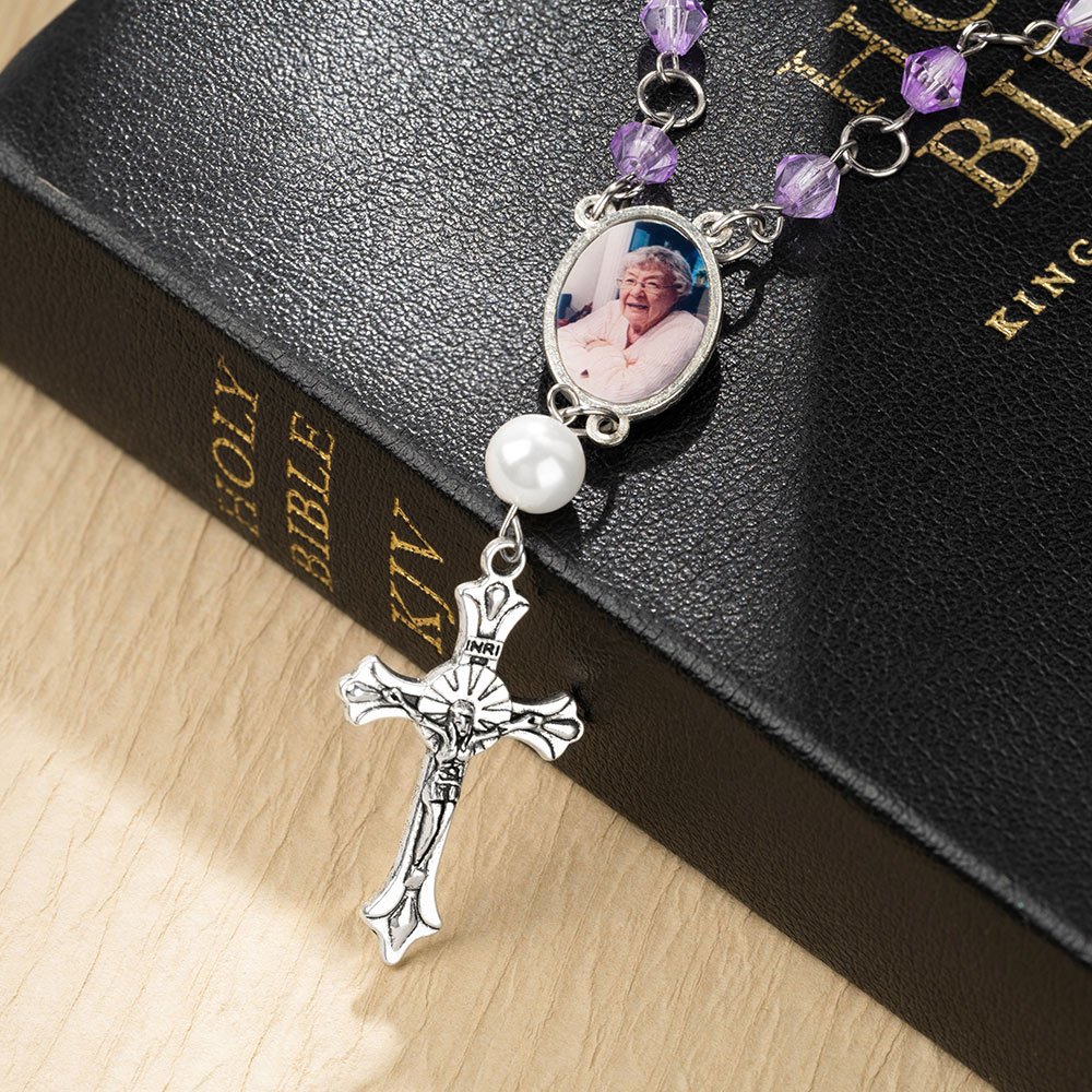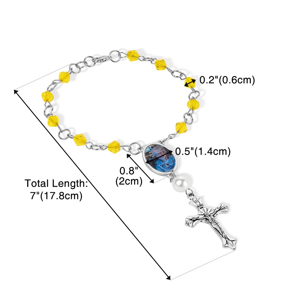 At the heart of this captivating rosary bracelet lies a unique photo charm, allowing you to showcase a cherished memory or a beloved family member. Elegantly complimenting the photo charm, a delicate cross pendant, and a crystal bead adorn the bracelet, serving as a timeless symbol of your faith and devotion.