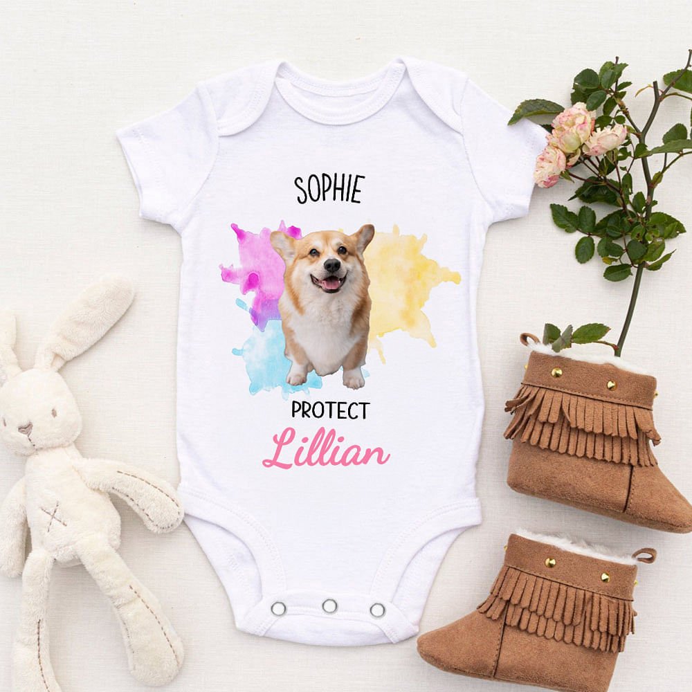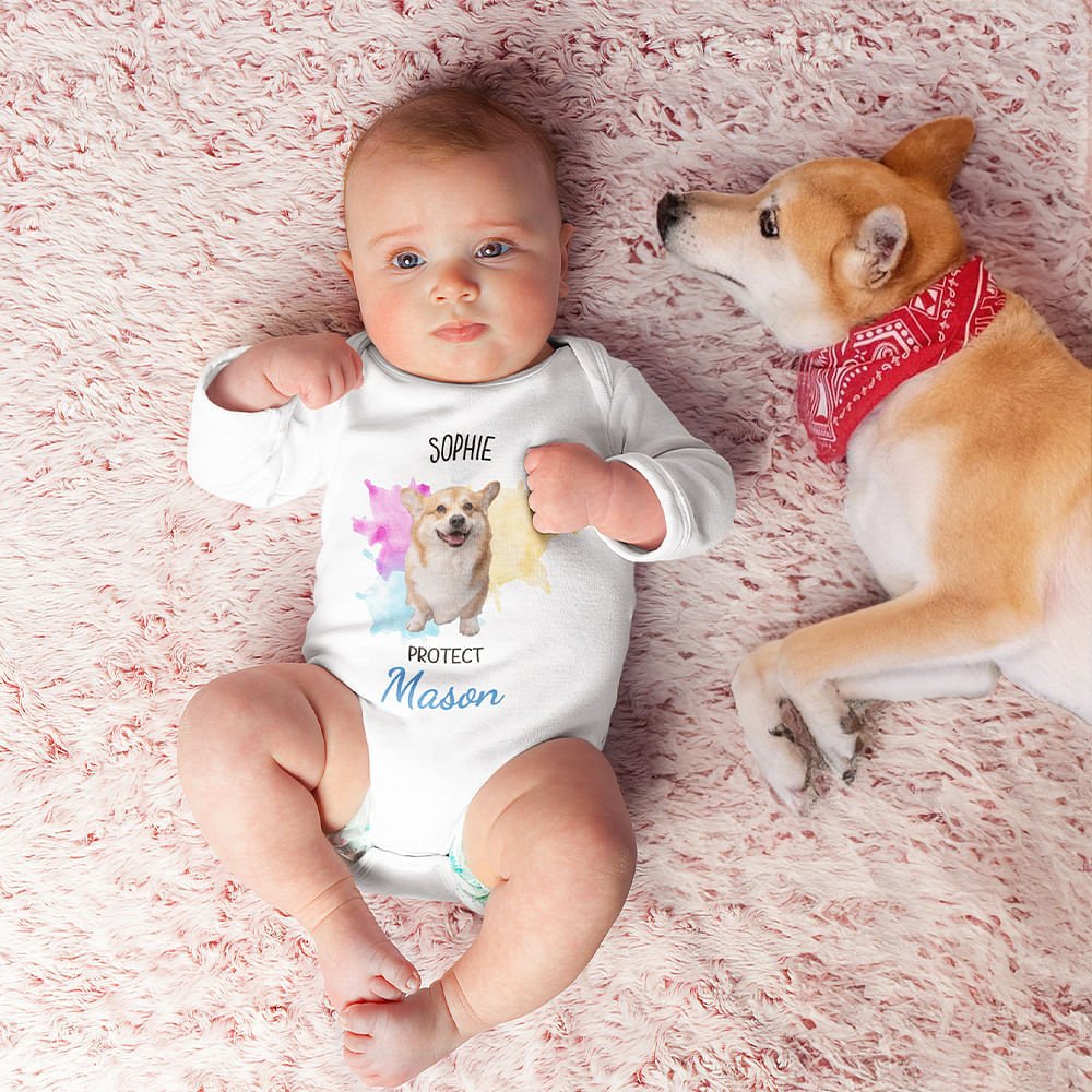 This onesie shows different dog characters, you can upload 1-3 photos to design. The background color block uses three bright colors pink, yellow, and blue, which not only attract the eye but also suit the aesthetic preferences of children. The figure of a dog is often associated with loyalty and protection, so having the word "protect" printed on the onesie suggests that these adorable pet characters play the role of guardians, adding to the fun and emotional value of the onesie.