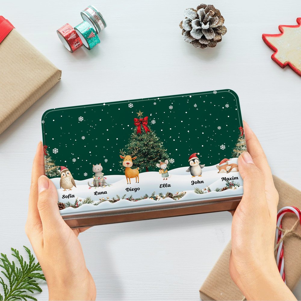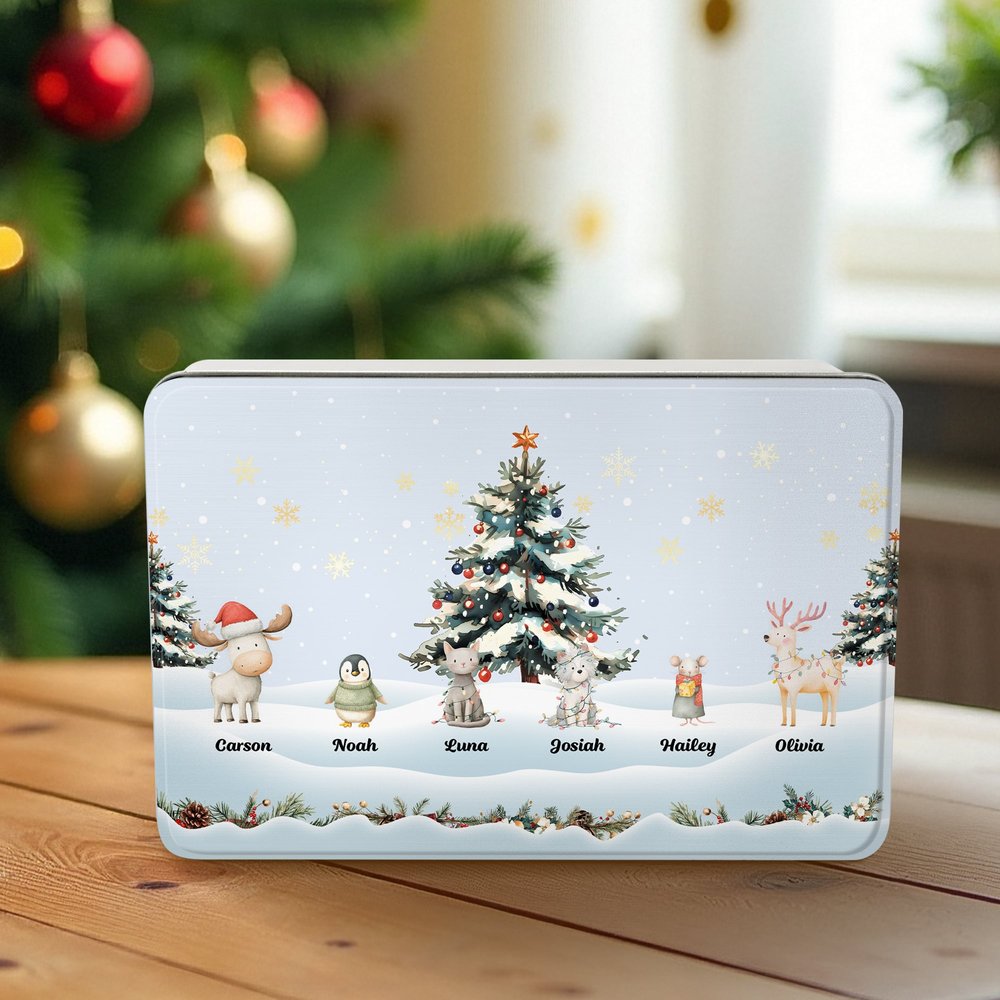 This biscuit tin features a Christmas forest party theme and offers 38 different cartoon animal patterns, including reindeer, penguins, mice, and cats, and so on. The background is adorned with snowflakes, Christmas trees, and other festive elements, creating a heartwarming scene. You can choose 1-6 animals and cleverly incorporate each family member's name into the scene, transforming an ordinary biscuit tin into a magical treasure box that holds family stories.